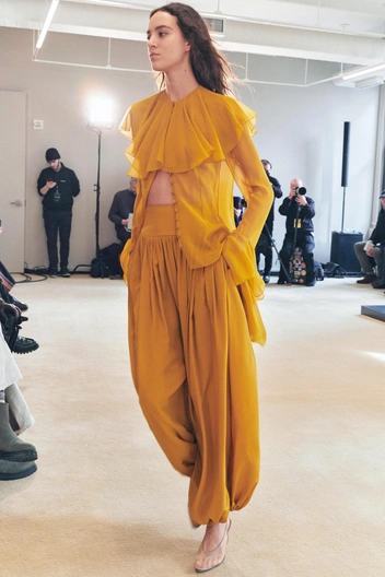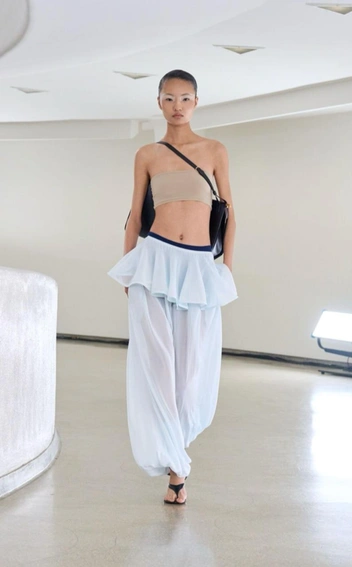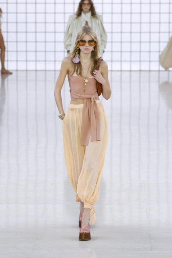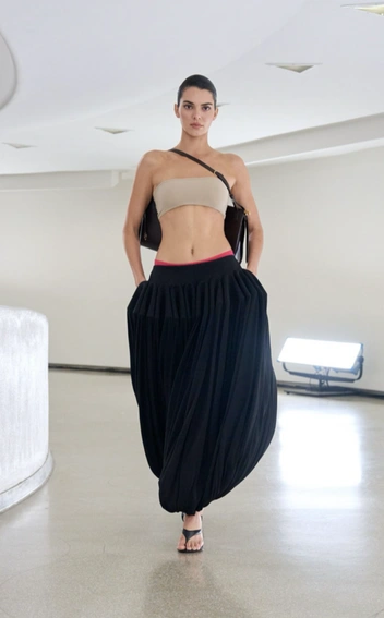 Скажем пару слов отдельно про кроп топ, который хорош с шароварами и без туники. Надевая укороченный топ с шароварами, мы создаем контраст между верхней и нижней частью образа. А чтобы придать интересных деталей, наденьте под шаровары яркое нижнее белье, как Кендалл Дженнер на показе Alaia.