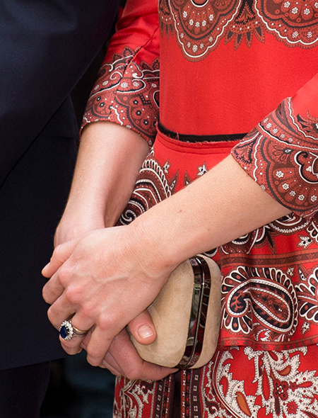 Дополнили образ будущей королевы Великобритании бежевые лодочки LK Bennett стоимостью 445 фунтов стерлингов (около 43 000 рублей), которые она, к счастью, надела на голые ноги, а не на капроновые колготки, чем изредка грешит ради этикета. В качестве стильных, но невызывающих аксессуаров Кейт Миддлтон выбрала массивные серьги ювелирного бренда Cassandra Goad (1 495 фунтов стерлингов - около 142 000 рублей) и нюдовый замшевый клатч прямоугольной формы от Russell and Bromley (165 фунтов стерлингов - около 16 000 рублей) с металлической застежкой, похожей на ту, что использовалась в ридикюлях.