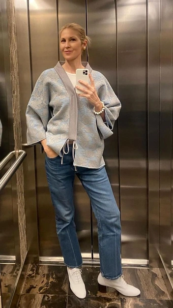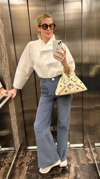 Особенно это касается джинсов и брюк. Так, например, в гардеробе Келли Разерфорд есть самые трендовые модели, но чаще всего вы встретите ее в классических мом-джинсах, которые, кстати, тоже стали частью «тихой роскоши». Почему именно они? Во-первых, такой фасон всегда будет в моде. Во-вторых, высокая посадка и зауженный крой позволят подчеркнуть бедра и талию и визуально удлинить ноги. Носить мом-джинсы можно с самой разной обувью, но стильные аутфиты получатся с женственными вариантами: лоферами, босоножками, мюлями или сабо. То же касается и других предметов гардероба: если джемпер, то в меру свободный, но не свисающий, если блуза, то открывающая шею, а если юбка, то на высокой посадке.