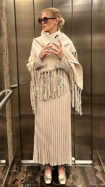 Но все же главное правило самых стильных женщин мира — найти то, что будет вас выделять, и никогда не изменять себе и своим ценностям. Вы можете интегрировать тренды в свой гардероб, но не делать их базой, иначе какой же стиль у вас будет? Что в таком случае выделяет Келли Разерфорд? Это объемные фактурные платья, жилетки и куртки без воротников, страсть к круглым очкам и умение стилизовать базу с главными тенденциями сезона.