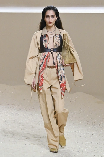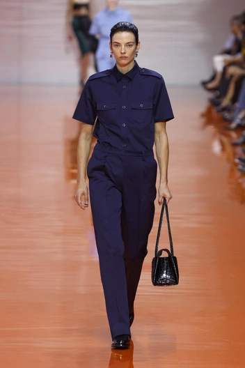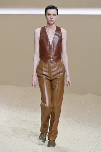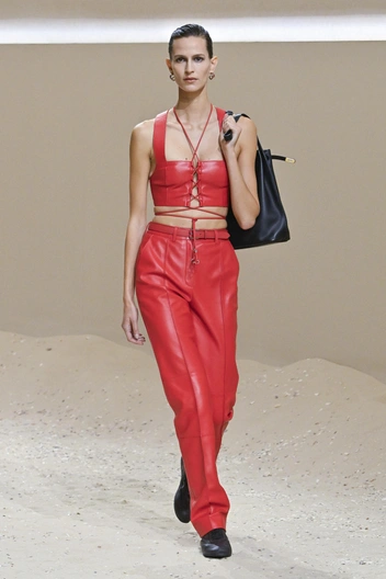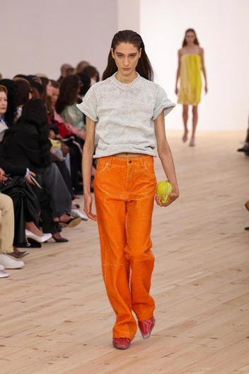 Главные адепты яркого гардероба — Loewe, заставили всех в этом сезоне сместить фокус с привычных черных и серых оттенков на более необычные. Даже Hermès, которые редко выходят за грани песочных и коричневых цветов, не остались в стороне и добавили в коллекцию яркие брюки (читайте также: Дофаминовый осенний гардероб: как собрать и почему он нужен каждой).