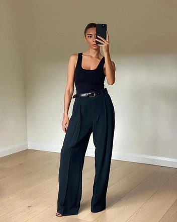 Главный плюс брюк на низкой посадке — легкость в создании расслабленного, чуть неформального образа. Они также отлично подойдут и для вечерних выходов: наденьте их с атласным топом и блейзером, а для повседневных аутфитов выбирайте верх с зауженными фасонами и заправляйте его в брюки. А чтобы еще сильнее подчеркнуть талию и удлинить ноги, добавьте крупный кожаный ремень и ботинки на небольшом каблуке.