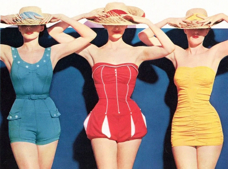 В 1940-х годах существовали цельные и раздельные купальники, хотя вторые совершенно не были похожи на те, что сегодня носят на пляжах. Их шили из плотной ткани и напоминали они, скорее, шорты или юбку-шорты с укороченной майкой.
