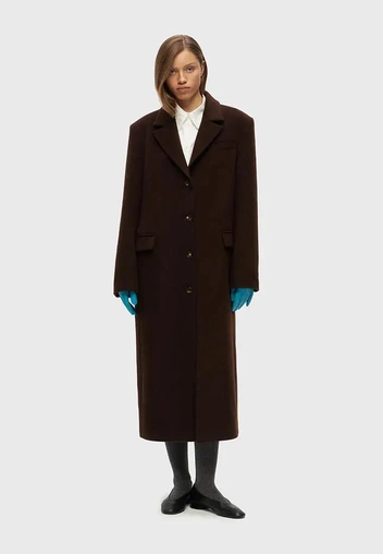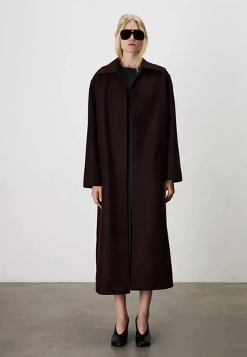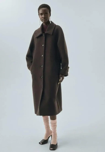 При этом пальто этого оттенка не превращает вас в бежевую стену: оно живет за счет глубины цвета и матовой фактуры.