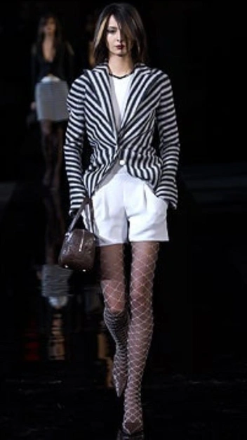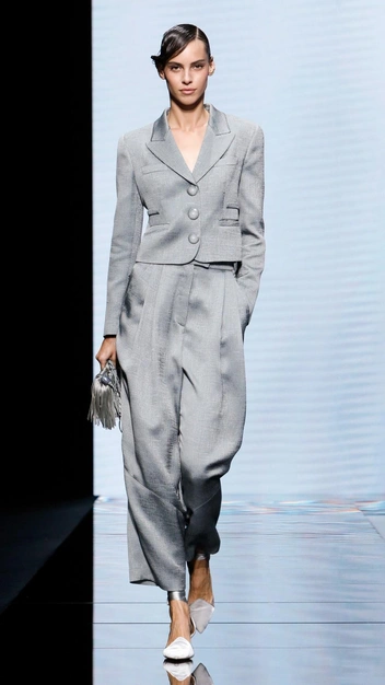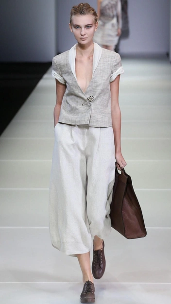 Именно Джорджо Армани превратил мужской брючный костюм в женский. Прямой пиджак он сделал укороченным и приталенным, наделил его более мягкими линиями, элегантными пуговицами и не такими широкими плечами. Брюки модельер укоротил и «посадил» на высокую талию — такого кроя он придерживается в работе до сих пор.