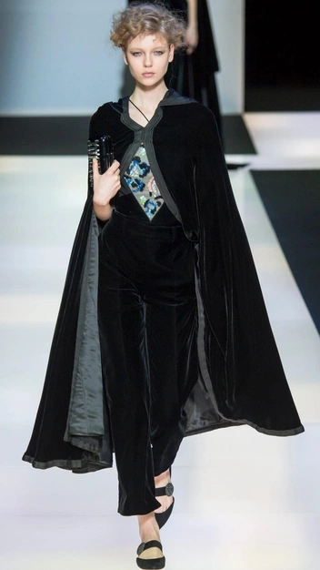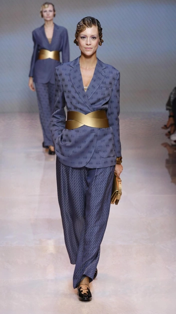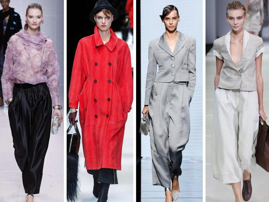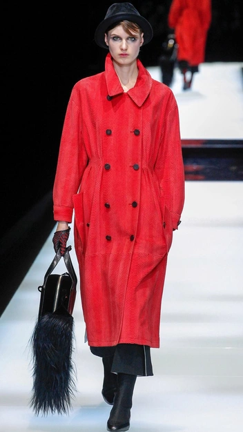 Кстати, здесь у Джорджо Армани тоже прослеживается женственный силуэт. В коллекциях вы можете увидеть приталенный силуэт, покатые плечи, округлый воротник, расклешенный подол.