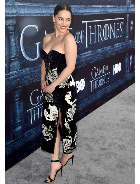 В саге о Семи Королевствах она – Мать Драконов, Дейенерис Таргариен, так что, ей по роли положено «зажигать». На серой ковровой дорожке Эмилия появилась в платье-корсете из черного бархата с принтом из белых лилий на длинной узкой юбке с высоким разрезом. Верх платья под девизом «нечего скрывать» однозначно забрал на себя большую толику внимания фотографов и репортеров мероприятия.