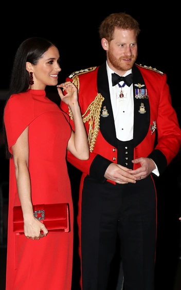Пожалуй, именно это появление герцогов на музыкальном фестивале Mountbatten в Альберт-холле можно назвать самым ярким и впечатляющим за все время жизни Меган и Гарри в королевской семье. Пара решила сыграть по крупному и выбрать ключевым оттенком парного выхода алый. Герцогиня предстала в красном платье в пол Safiyaa (такое же платье есть у нее в ярко-голубом оттенке), а герцог — в парадной военной форме (читайте также: От алого до бордо: как носить красный цвет повседневно).