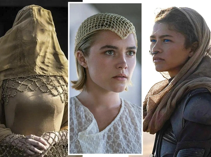 Поклонники научно-фантастического фильма не оценили трейлер второй части и появления в ней Флоренс Пью: по мнению многих, героиня не совсем подходит на роль принцессы Ирулан — не такая уж она и статная красавица, какой ее описывает в книге автор романа Фрэнк Герберт. Тем не менее, уже с первого взгляда восхищают головные уборы, в которых появляется актриса. И здесь вновь происходит симбиоз прошлого и будущего: закрытый шлем, повторяющий силуэт черепа головы и шеи, а также аксессуар из бисера для волос соединяют в себе как эпоху Средневековья, так и футуризм со своими округлыми формами и металлизированным эффектом.