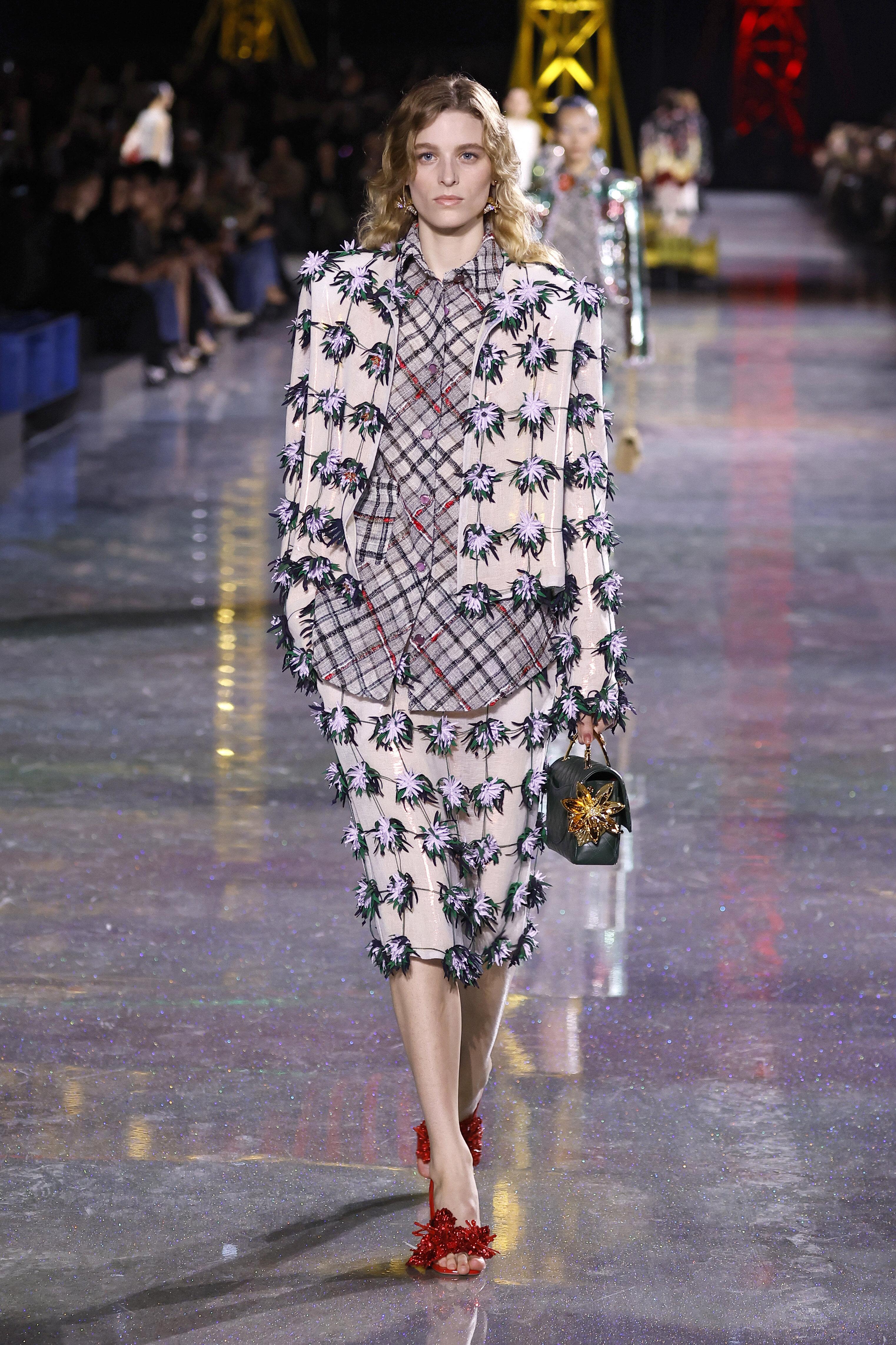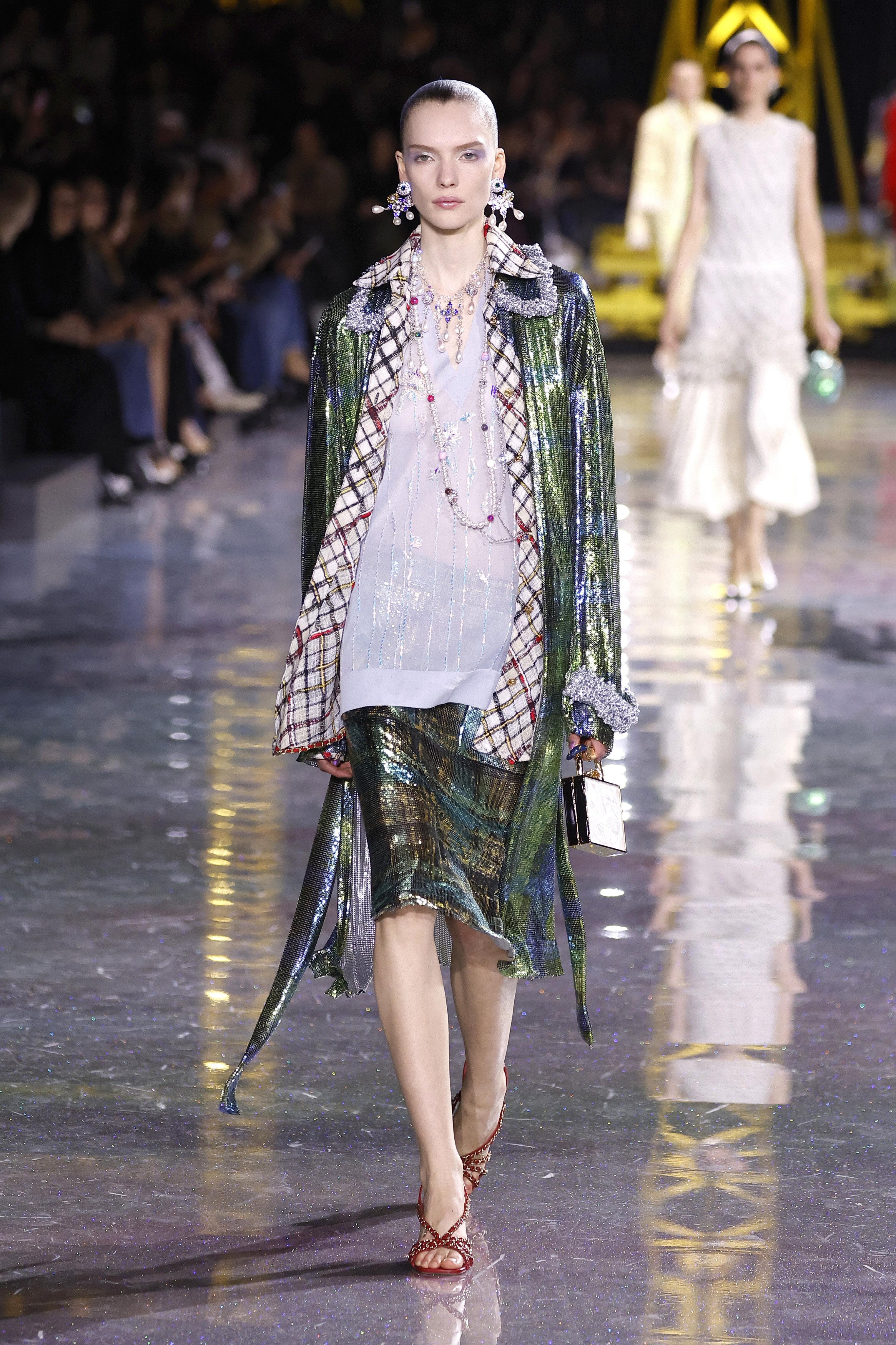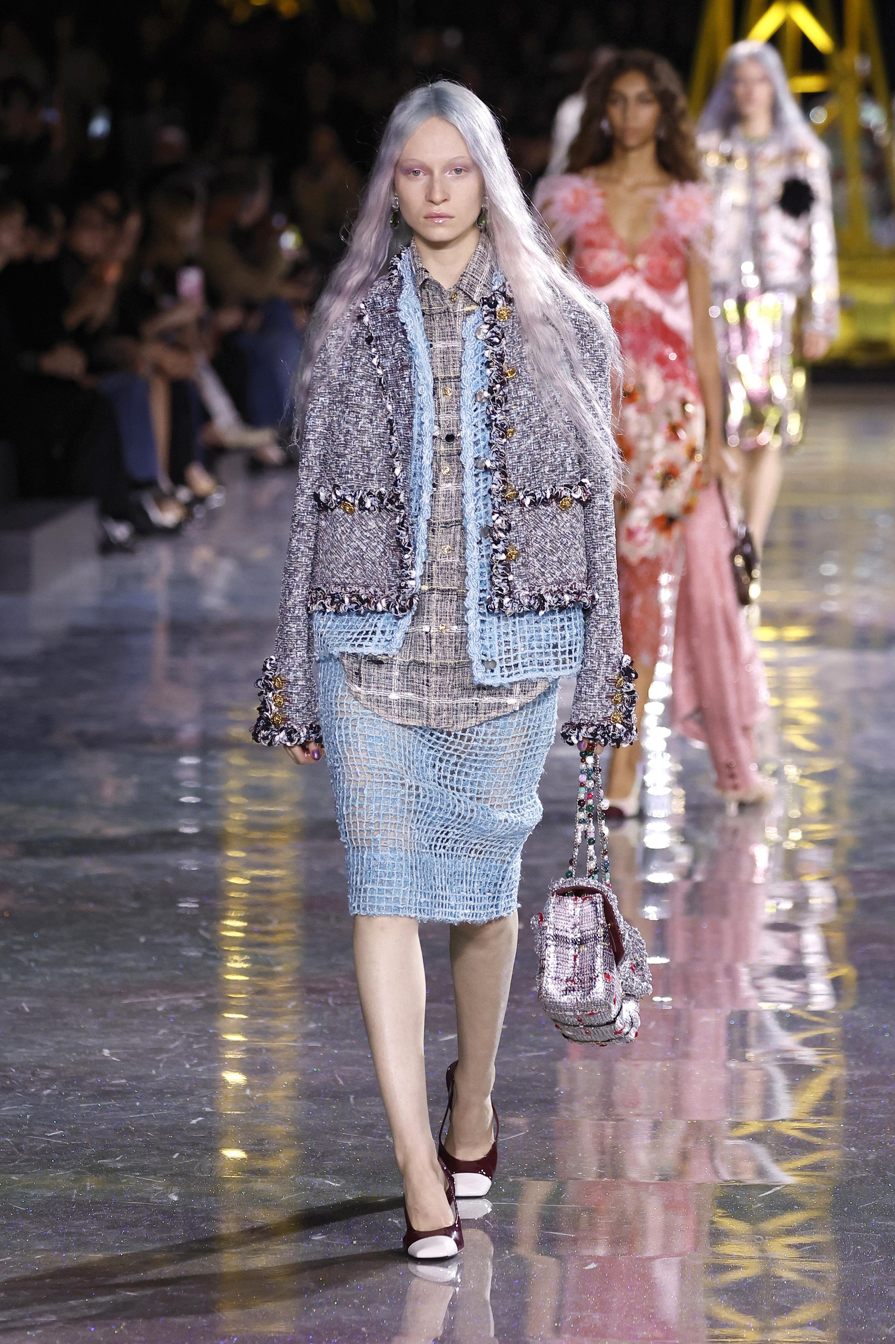 Как и ожидалось, к середине шоу вы видим, как из куколки наконец выбирается прекрасная бабочка. У Блази она носит твид, обильно сдобренный блестками, развевающиеся на юбки, составные платья из шелка, кружева и шифона, украшенные вышивкой и цветочной аппликацией. При этом быть слишком уж нежной она не спешит. На это, как минимум, работают активные фактуры: пестрый объемный трикотаж, разноцветный мех, сверкающие пайетки и имитация чешуек.