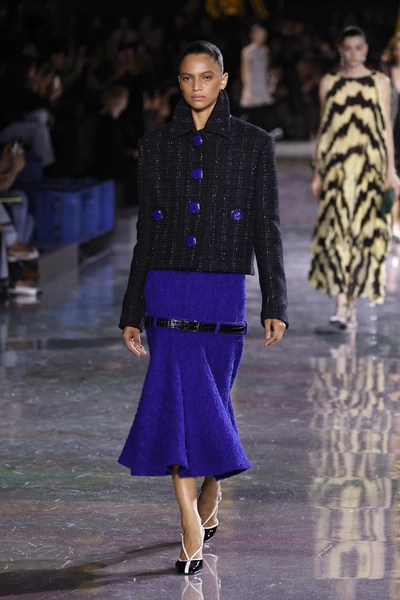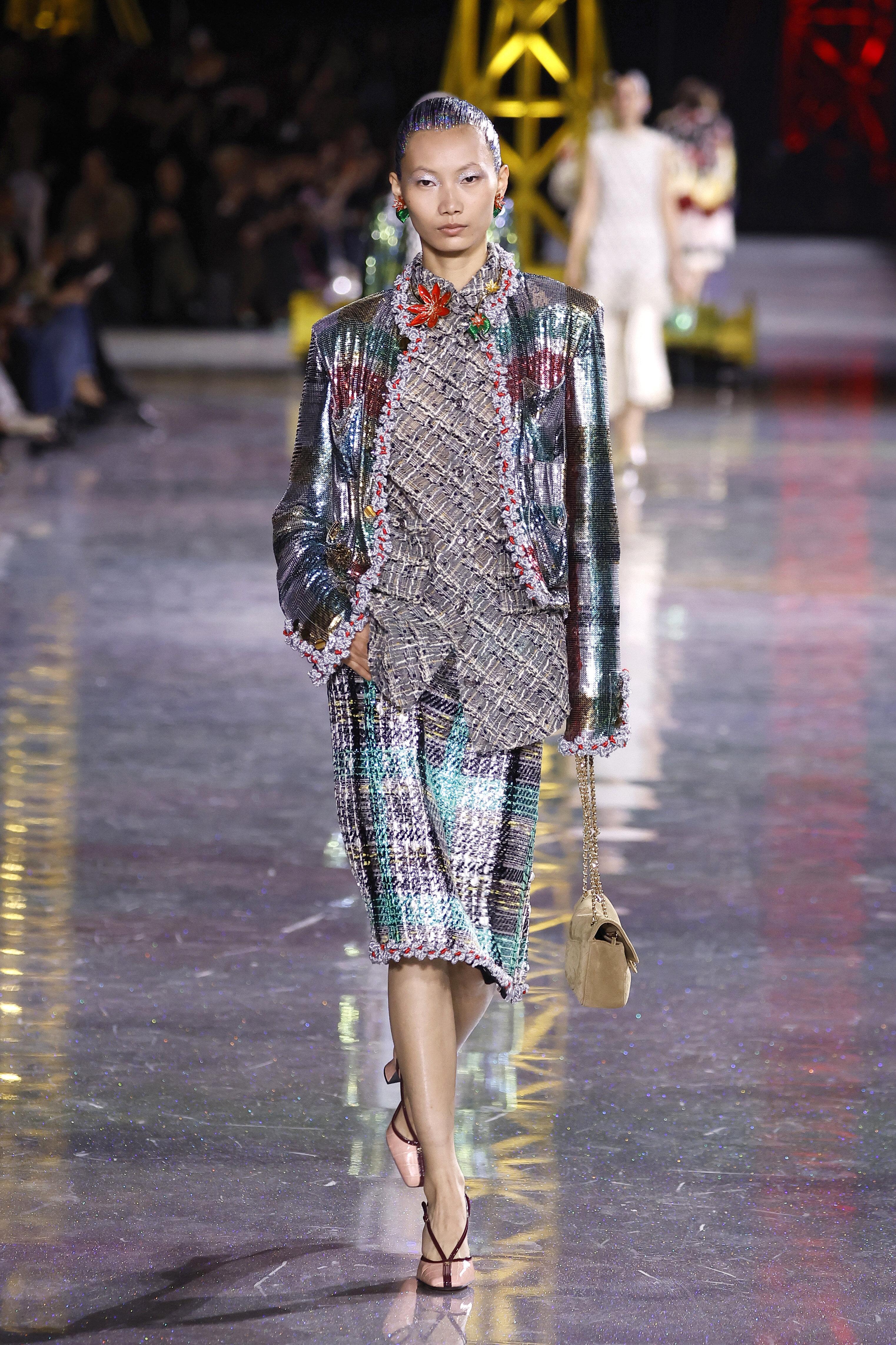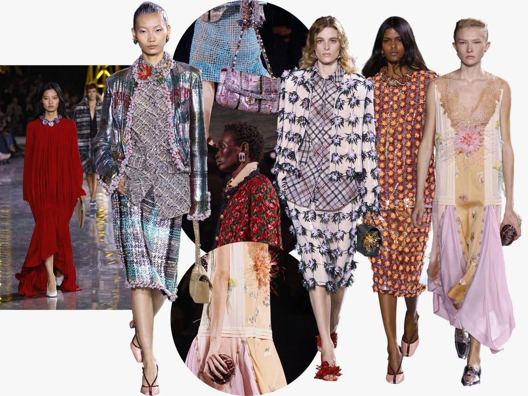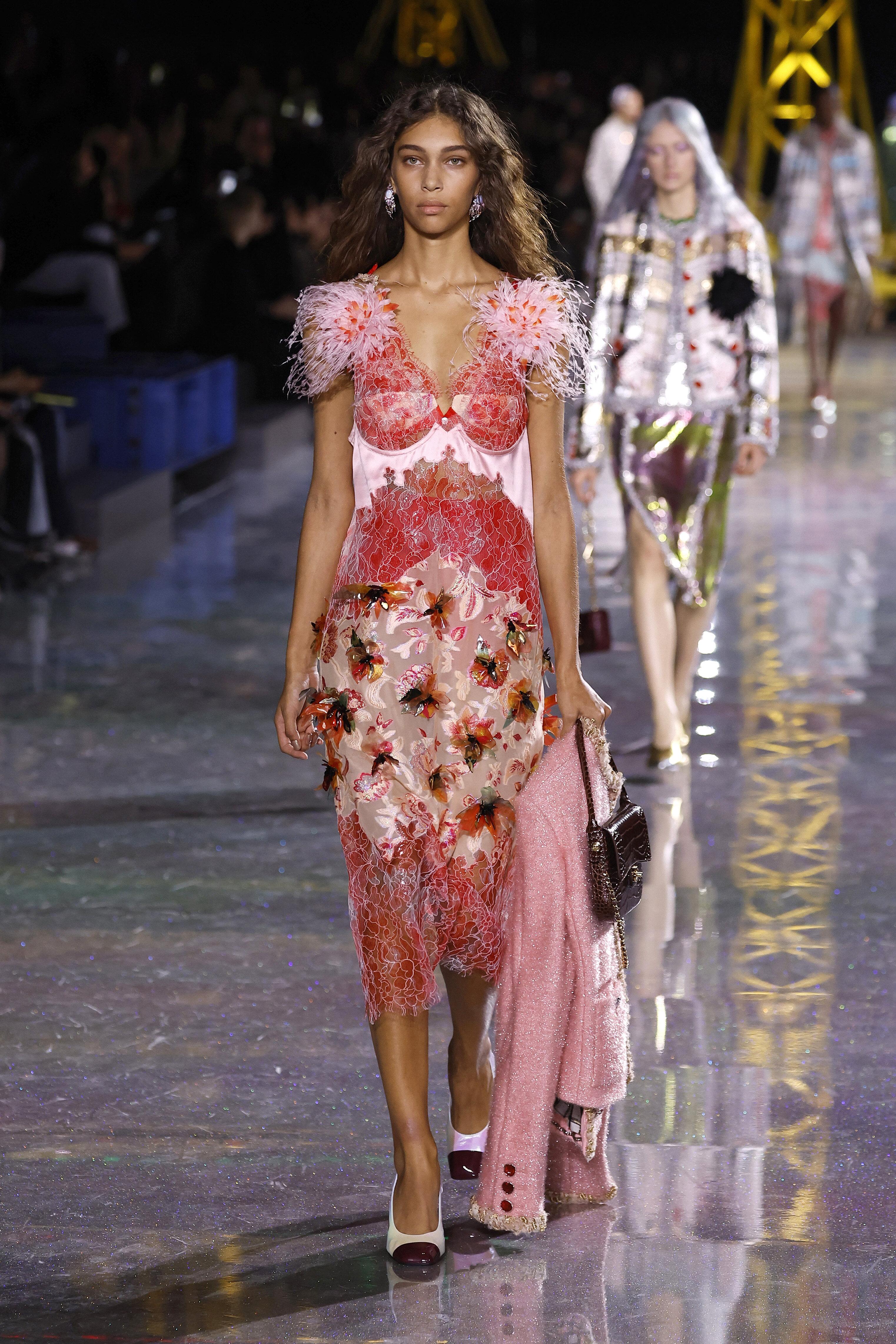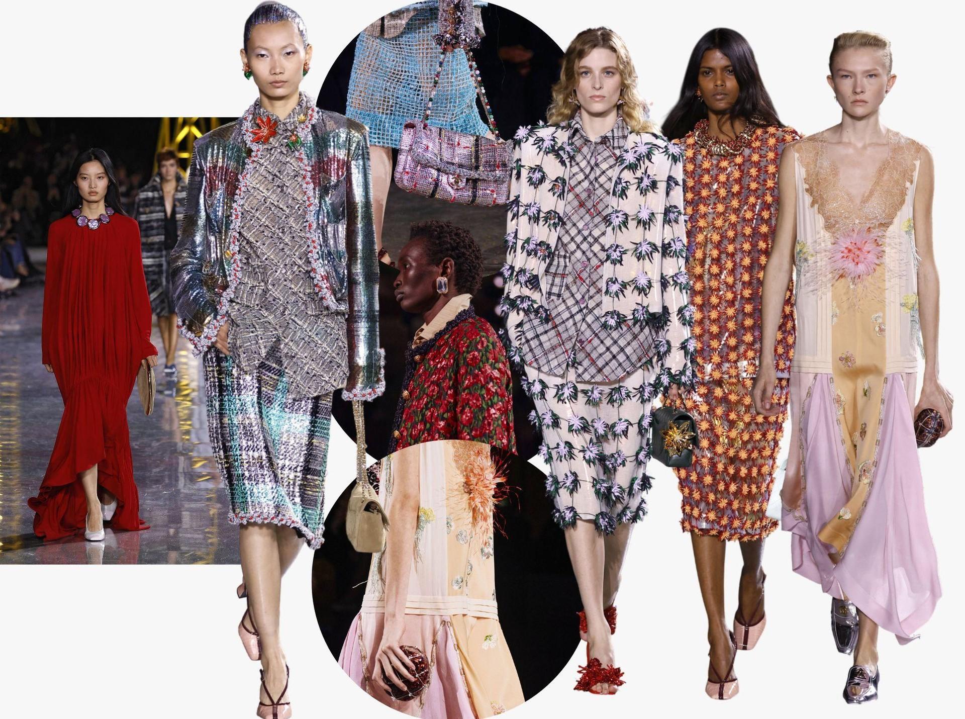 Как и ожидалось, к середине шоу вы видим, как из куколки наконец выбирается прекрасная бабочка. У Блази она носит твид, обильно сдобренный блестками, развевающиеся на юбки, составные платья из шелка, кружева и шифона, украшенные вышивкой и цветочной аппликацией. При этом быть слишком уж нежной она не спешит. На это, как минимум, работают активные фактуры: пестрый объемный трикотаж, разноцветный мех, сверкающие пайетки и имитация чешуек.