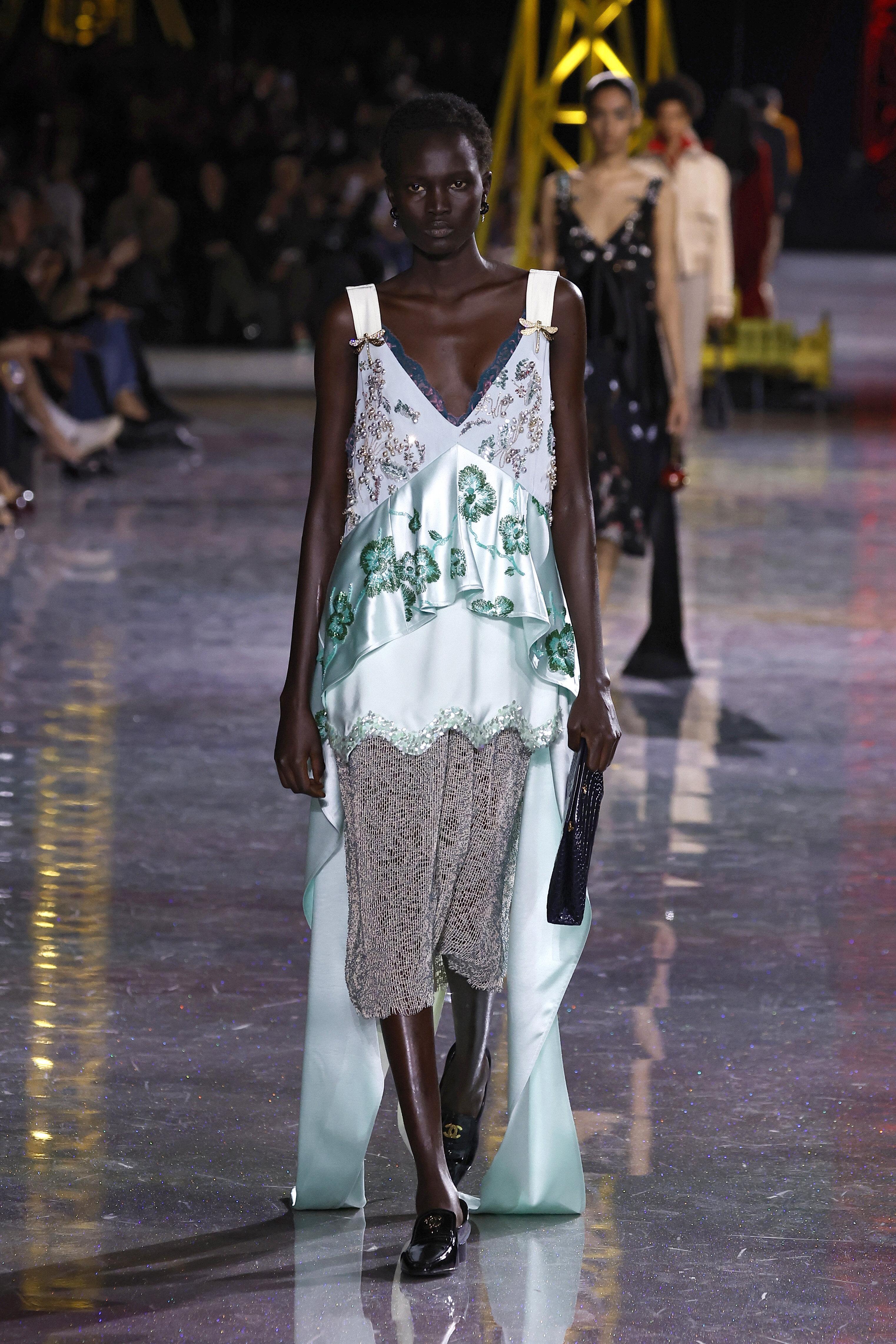 Отдельно считываем отсылку к 1920-м — временам, когда Шанель начинала свой путь кутюрье. Во вселенной Блази эта эпоха отмечается экстремально заниженными талиями, порой настолько, что ремни оказываются почти на уровне колен, и платьями-флэппер, в которых запросто можно было бы отправиться на один из балов Джея Гэтсби (читайте также: Вещи-легенды: модное наследие Коко Шанель).