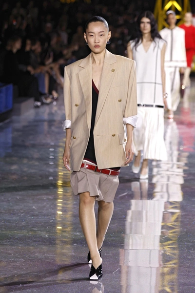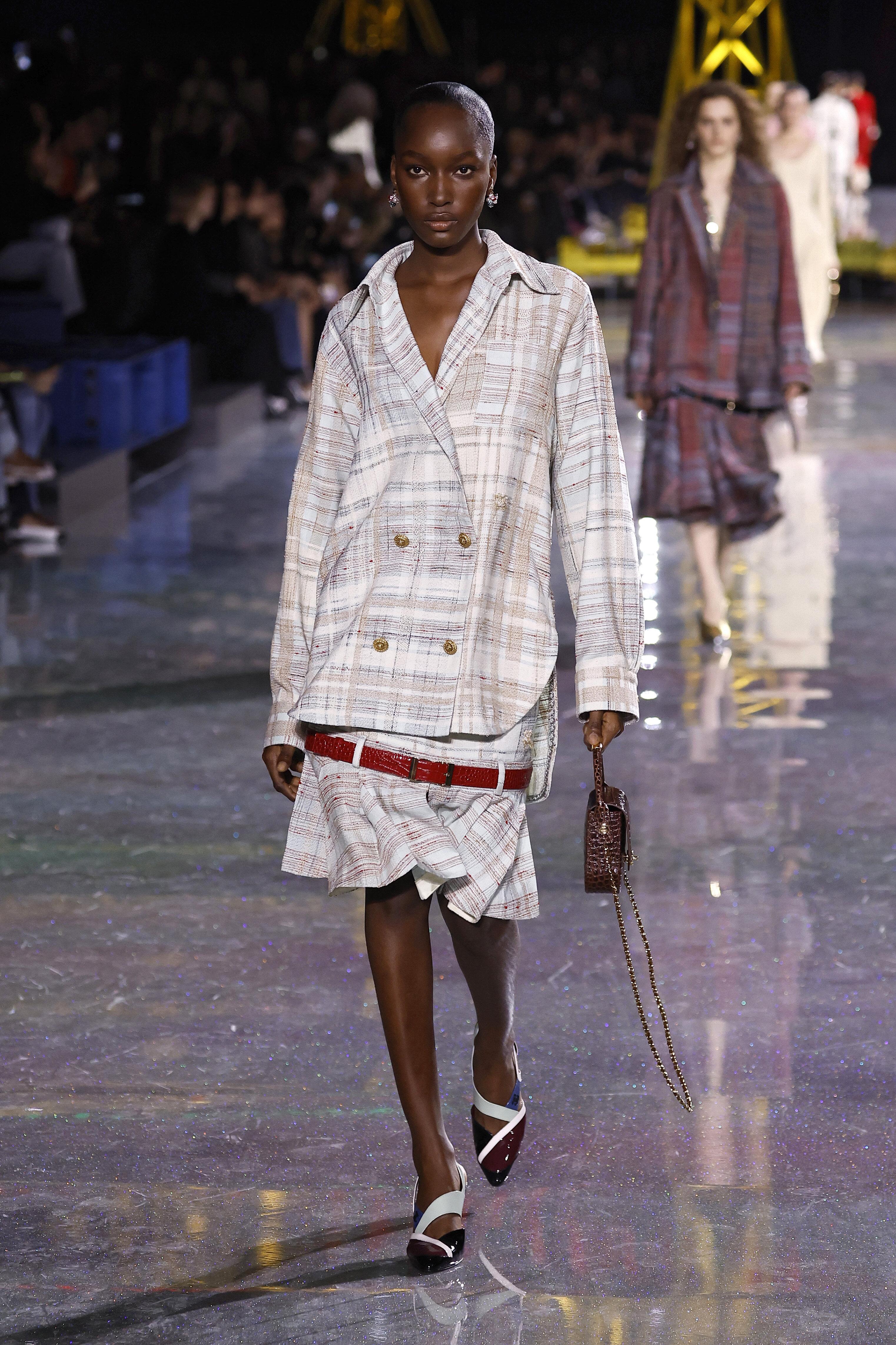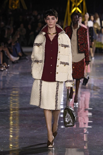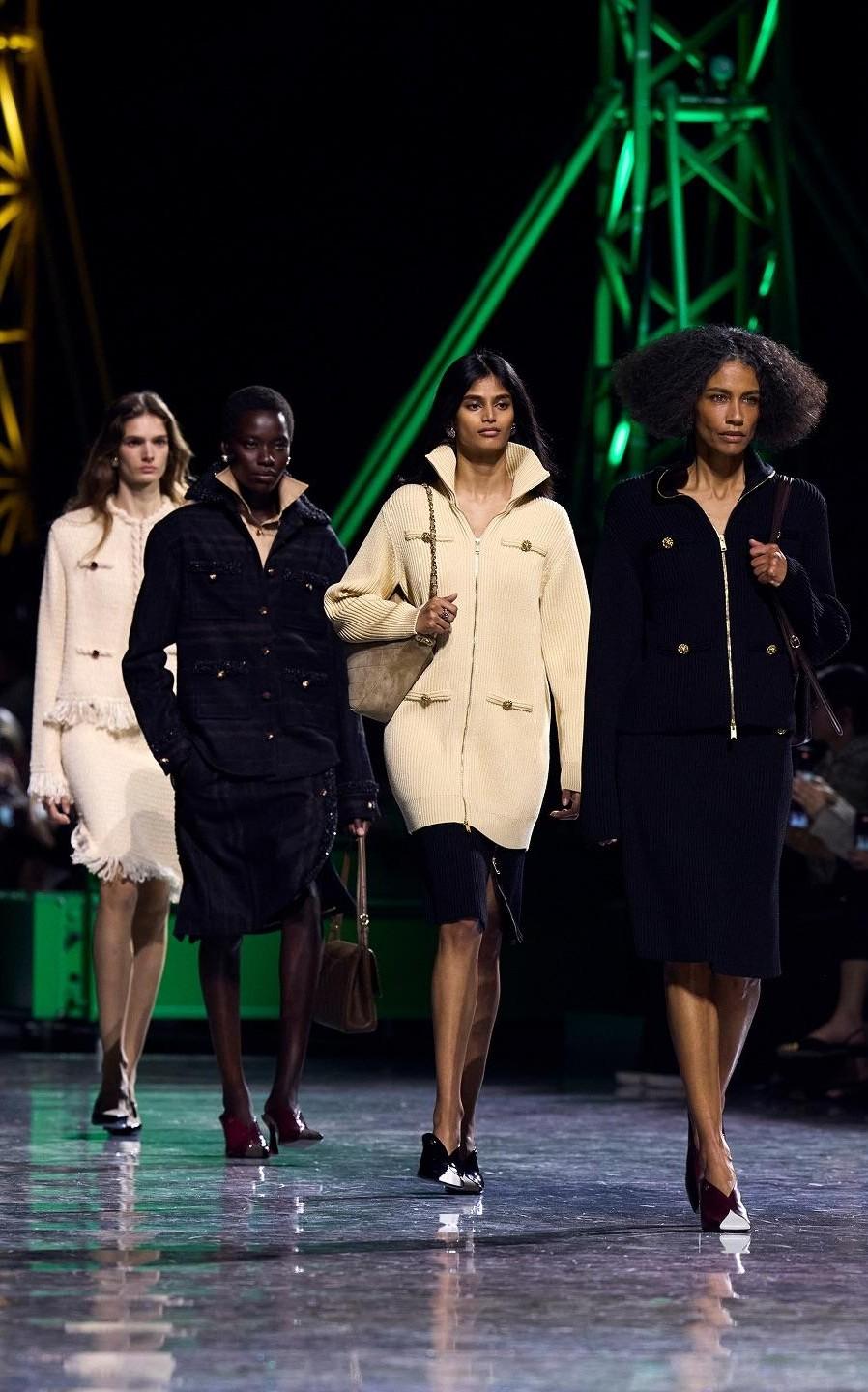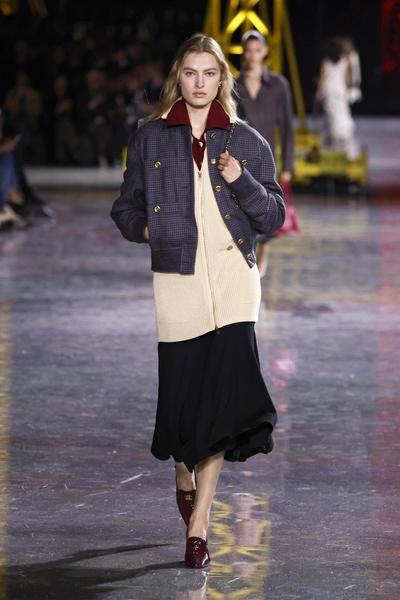 Их он продолжает постепенно усложнять по мере развития новой коллекции. В повседневной части шоу длинные трикотажные кардиганы на молнии сменяются сначала мягкими жакетами из шерсти, затем классическим твидом. А после на новый уровень восходит и стилизация — к уютным курткам дополнительным слоем прибавляются рубашки и кардиганы тонкой вязки, а юбки трансформируются в удобные шорты. То же происходит и по части цвета: сначала зрителя встречает монохром, в котором со временем вспыхивают то яркие краски, то активные принты, вроде сложной клетки и мелкой полоски.