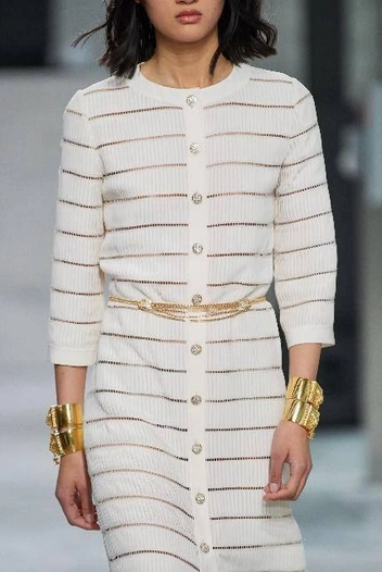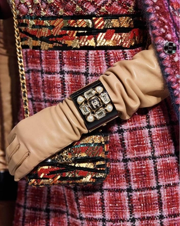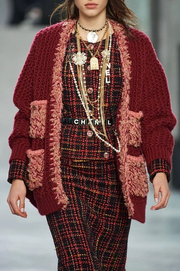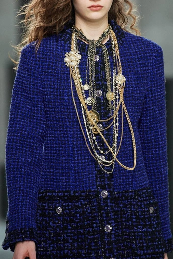 Модный дом Chanel давно сделал многоярусные колье своей визитной карточкой, зимой же Виржини Виар предлагает носить массивные цепи и ожерелья поверх классического твидового жакета.