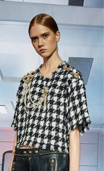 Крупные гипертрофированные броши не думают уступать позиций на подиумах третий сезон подряд. В этот раз дизайнеры усыпали ими лацканы жакетов, косух и пальто, как орденами. Абсолютный фаворит — это сочетание принта гусиная лапка и жемчуга в гранжевом прочтении на показе Balmain.