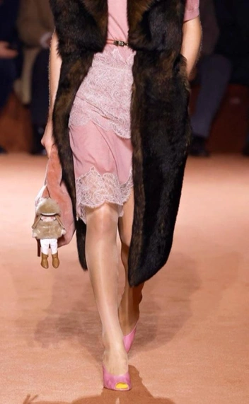 Но как быть, если хочется, чтобы розовый выступал лишь деликатным акцентом, а не перетягивал все внимание на себя? На этот случай на показах тоже нашлись варианты — например, розовый только в аксессуарах, таких как гольфы. Или же добавьте в образ с помощью сумки, палантина или шапки — так вы аккуратно интегрируете розовый в аутфит (читайте также: Капсула на осень 2025: 15 вещей, которые вам понадобятся).