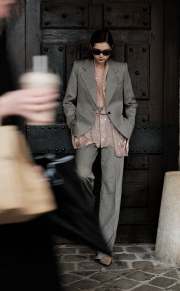 От вечернего аутфита переходим к классике и тому, как розовый цвет видят в Barbara Bui. Бренд считает, что офискор с рубашкой и брючным костюмом — немного устаревший вариант, и предлагает носить в рабочие стены яркие пайетки. Да не простые, а в розовом цвете — модель в Barbara Bui сочетает летящий топ с глубоким декольте со светло-серым костюмом. Но даже если носить этот образ в офис вы не решитесь, то точно возьмите на заметку сочетание цветов — светло-розовый и серый это база на все времена.