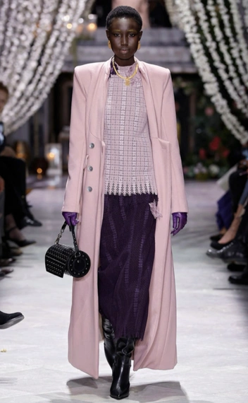 Модель Bibhu Mohapatra вышла на подиум в классическом кашемировом пальто в пол, которое точно стоит выбрать, если хотите выделяться на фоне обладателей серых и черных базовых пальто. Но интересно вот что — бренд предлагает носить йогуртовый оттенок с глубоким баклажановым цветом, и мы в восторге от этого сочетания. На фоне нежного розового фиолетовый выглядит завораживающе, а оттенок жвачки грамотно дополняет его. И, кстати, заметили тут тренд весны 2025 — цветные перчатки, которые, видимо, будут актуальны и осенью.