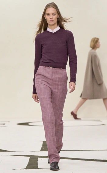 Похожее сочетание, но уже в классическом исполнении, показали на Calvin Klein Collection. Дизайнер Вероника Леони подобрала розово-сиреневые брюки к джемперу фиолетового оттенка, и завершила образ коричневыми лоферами. Этот образ напомнил нам формулу «A+A+B», которой пользовалась героиня сериала «Разделение» Хелли Риггс. Согласно этому модному лайфхаку, нужно сочетать цвета разного оттенка, но из одной палитры — как розовый и фиолетовый, с третьим, абсолютно полярным цветом — в данном случае, коричневым. И мы точно советуем взять этот прием на заметку — новая цветовая формула разбавит офисные аутфиты (читайте также: Формула «A+A+B»: как героиня сериала «Разделение» сочетает цвета (и почему вам нужно делать также)).