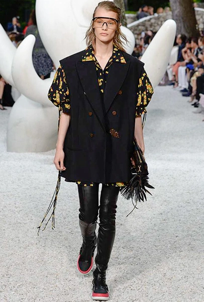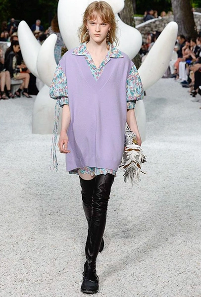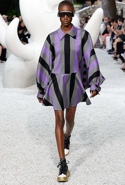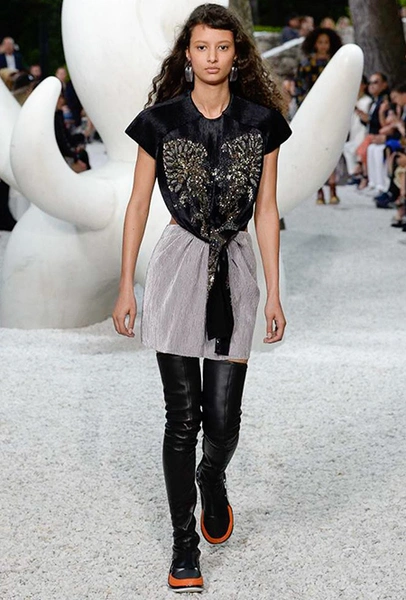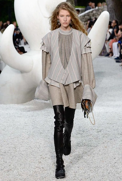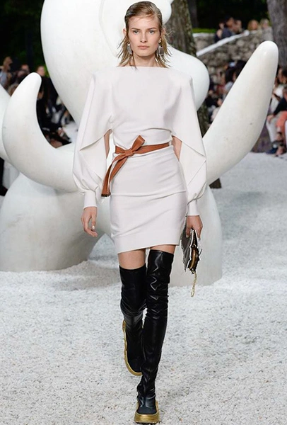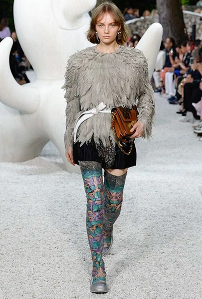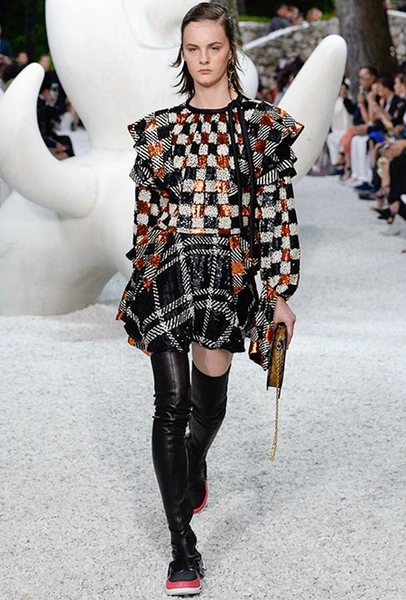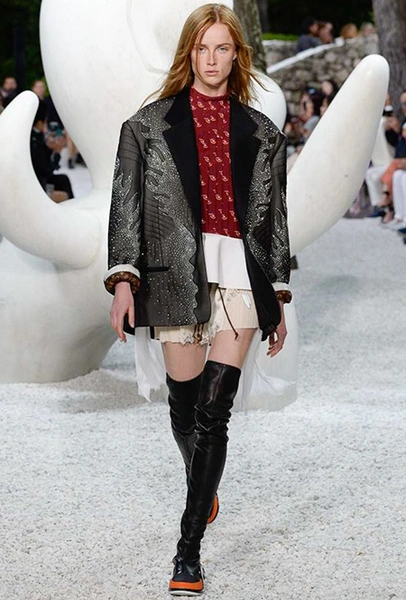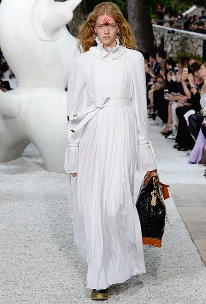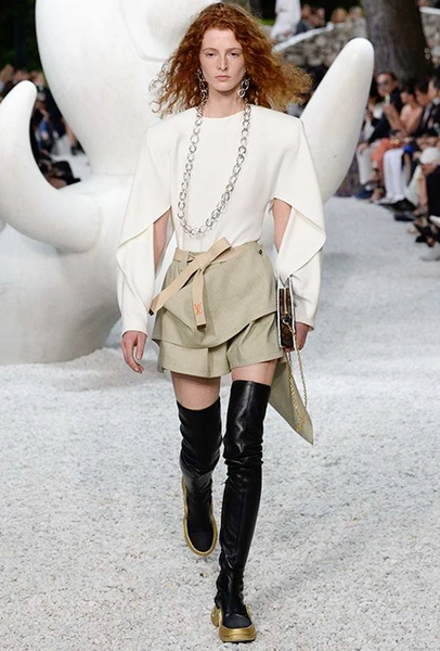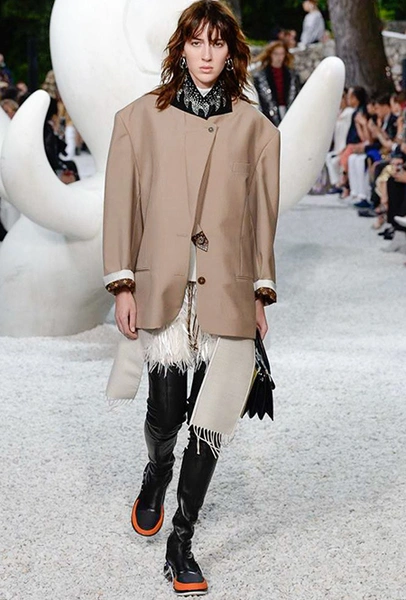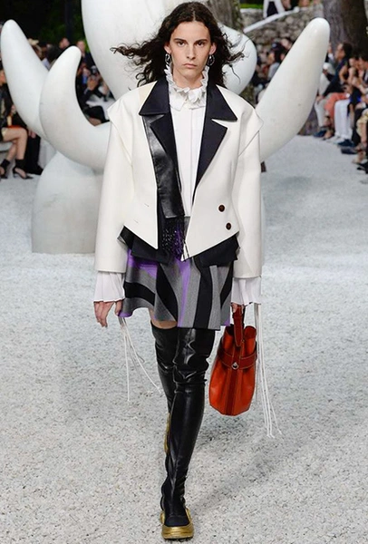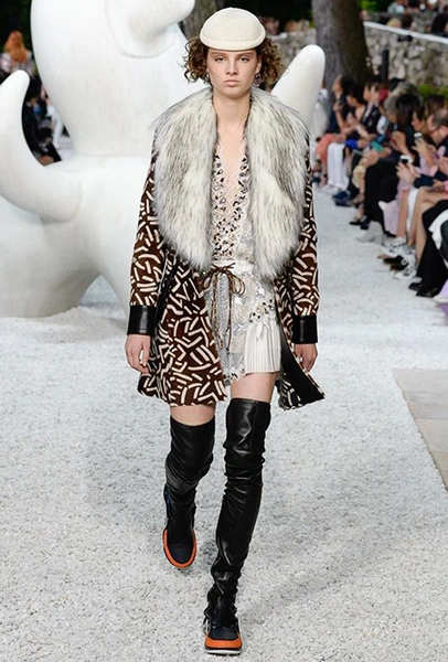 В своей работе прославленный французский дизайнер продолжает любимую тему ретрофутуризма. Правда, на этот раз ударение падает на первую часть этого слова: строгая серая клетка, плиссировки, объемные воланы, акцент на плечи, металлизированные фактуры и манера сочетать все это сразу намекают на 60-е и 80-е одновременно. За футуристическую составляющую отвечали сапоги-кроссовки — продолжение суперуспешной модели Archlight, своей формой напоминающие массивные луноходы. Но, пожалуй, даже их затмили аксессуары в форме животных, которые следующей осенью соберут наибольшее количество лайков в Instagram (запрещенная в России экстремистская организация). Их сотворила Грейс Коддингтон — одна из самых популярных креативных директоров планеты, талантливый иллюстратор и редактор. «Моя коллаборация с Николя и командой Louis Vuitton удалась… Я начала с животных — темы, которая объединяет меня и Николя далеко за пределами моды», — рассказала она.