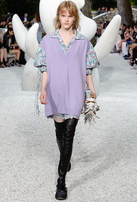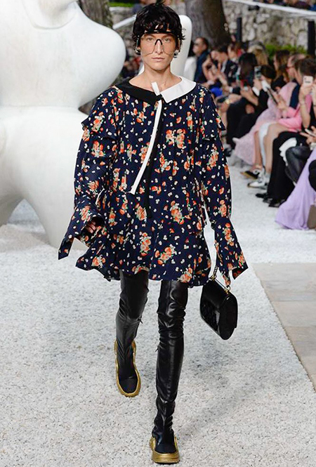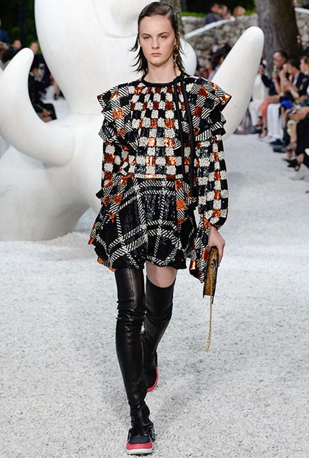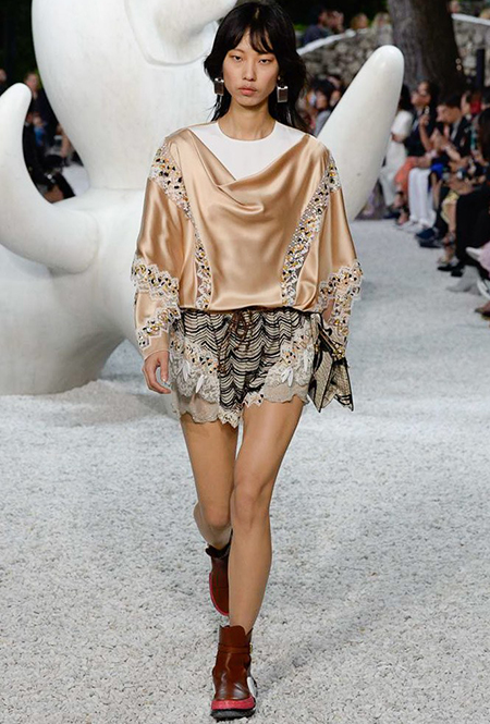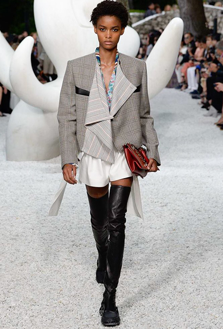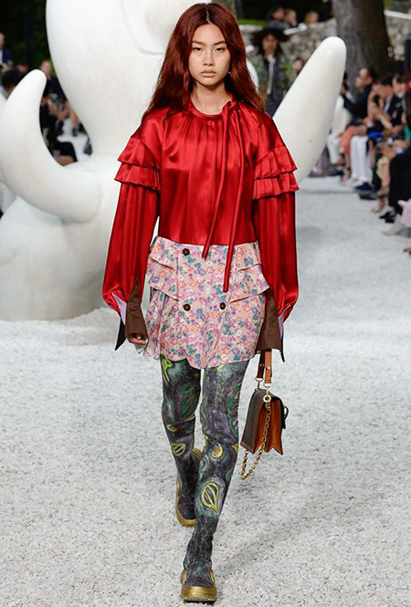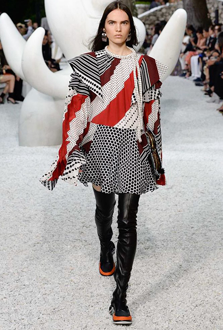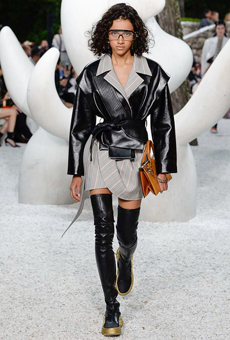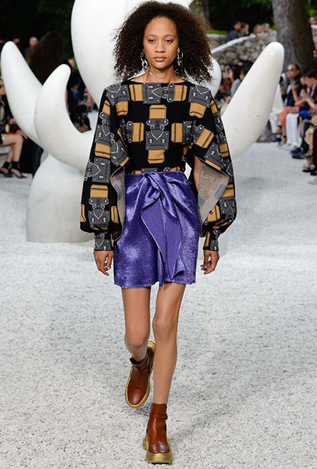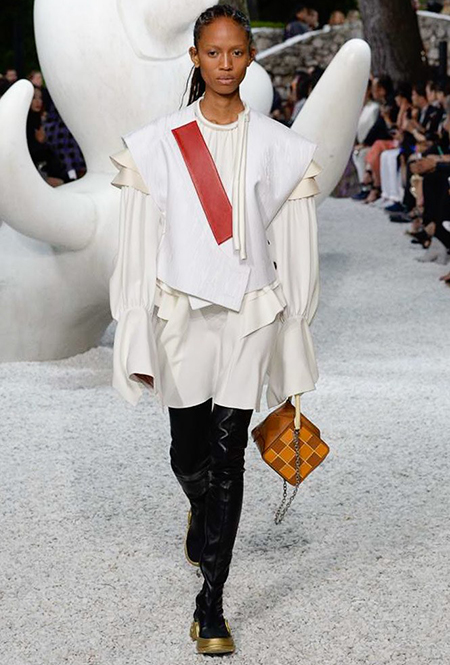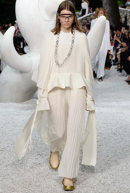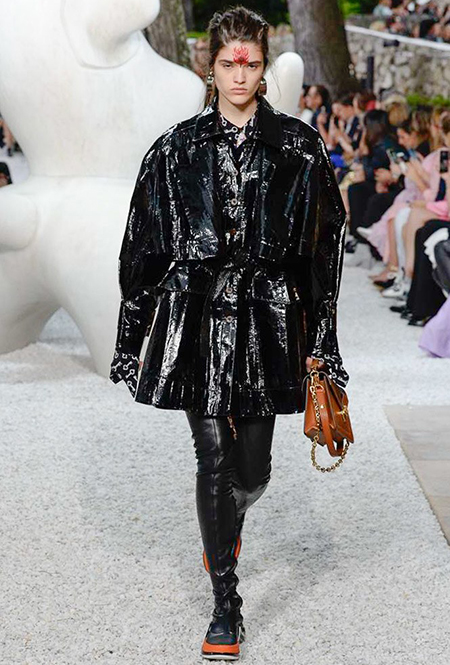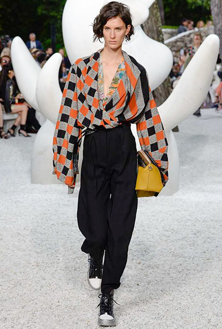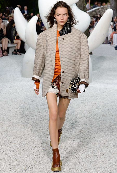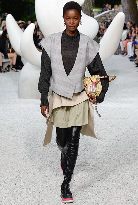 В своей работе прославленный французский дизайнер продолжает любимую тему ретрофутуризма. Правда, на этот раз ударение падает на первую часть этого слова: строгая серая клетка, плиссировки, объемные воланы, акцент на плечи, металлизированные фактуры и манера сочетать все это сразу намекают на 60-е и 80-е одновременно. За футуристическую составляющую отвечали сапоги-кроссовки — продолжение суперуспешной модели Archlight, своей формой напоминающие массивные луноходы. Но, пожалуй, даже их затмили аксессуары в форме животных, которые следующей осенью соберут наибольшее количество лайков в Instagram (запрещенная в России экстремистская организация). Их сотворила Грейс Коддингтон — одна из самых популярных креативных директоров планеты, талантливый иллюстратор и редактор. «Моя коллаборация с Николя и командой Louis Vuitton удалась… Я начала с животных — темы, которая объединяет меня и Николя далеко за пределами моды», — рассказала она.