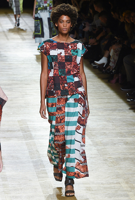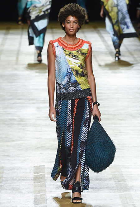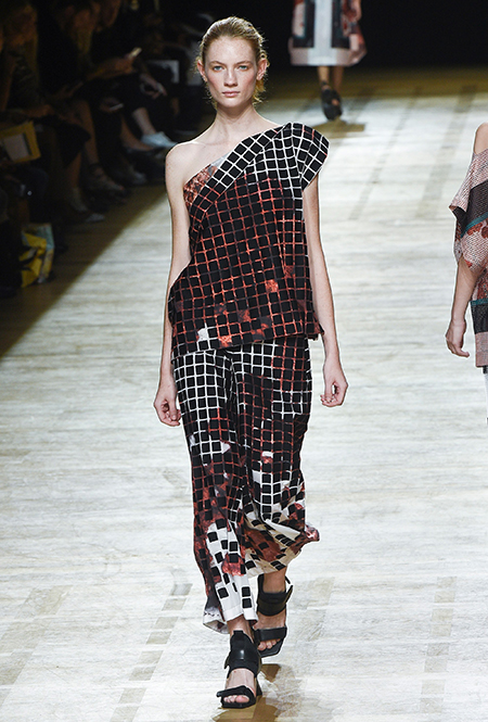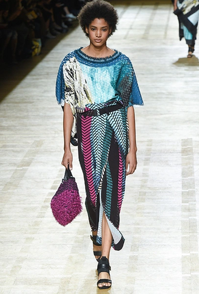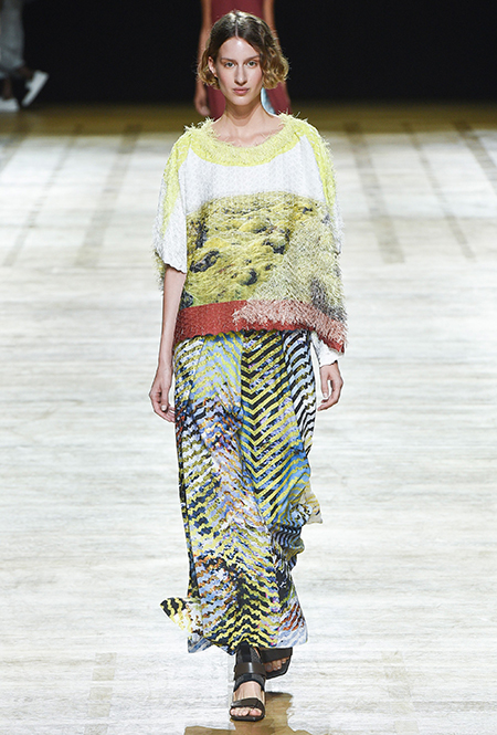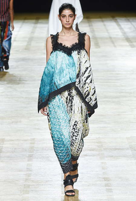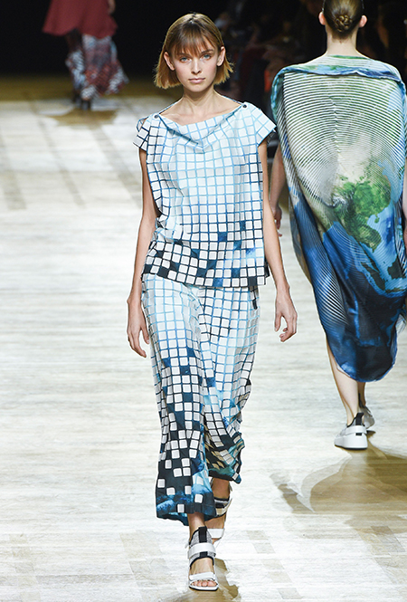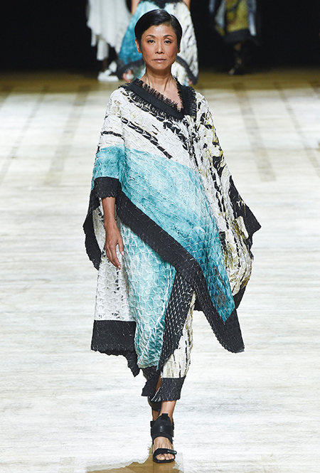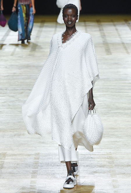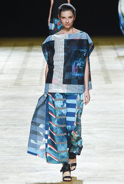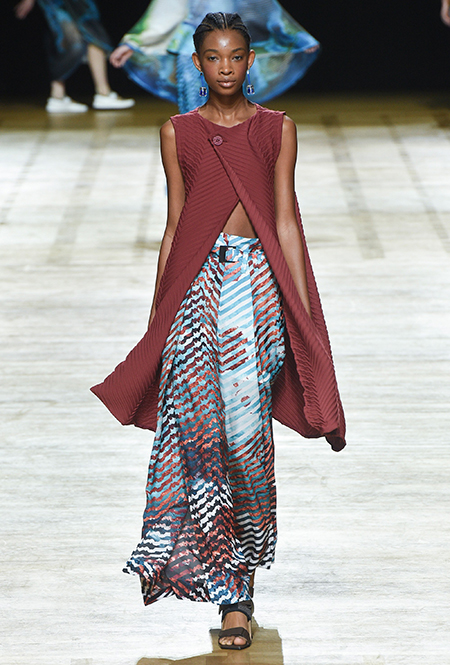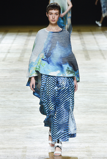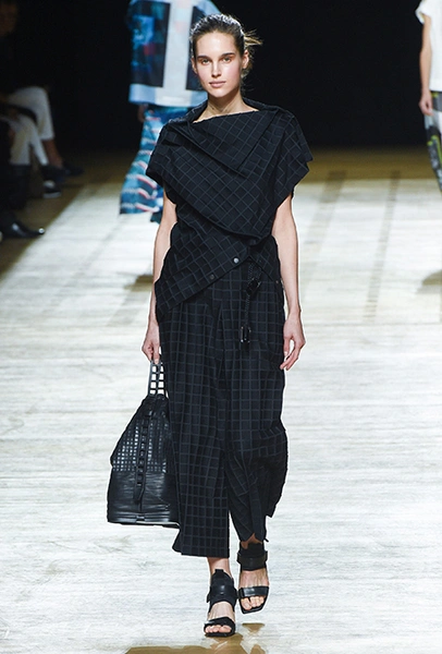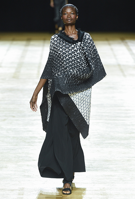 Что касается работы дизайнера с силуэтами, то здесь она выглядит несколько грубоватой: безразмерные пончо, практически без остатка покрывающие тело модели; расширяющиеся к талии (что, однако, не очень комплиментарно женской фигуре) и асимметричные на рукав топы; широкие в бедрах, но зауженные к низу брюки — все это и оказалось модой будущего сезона, какой ее видит Миямаэ.