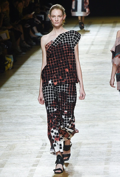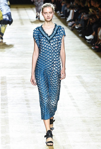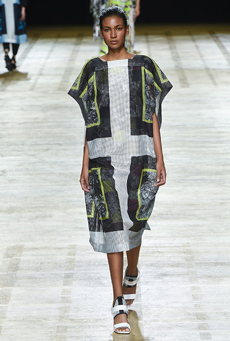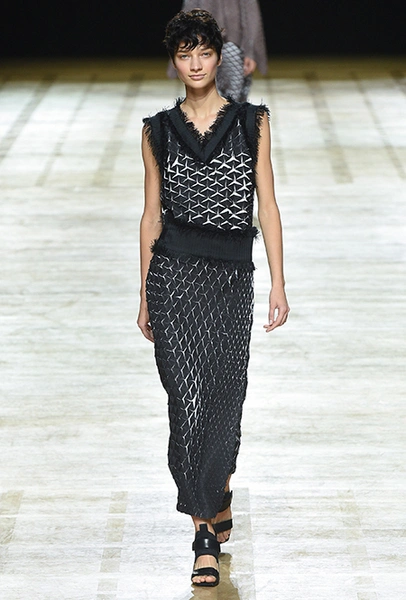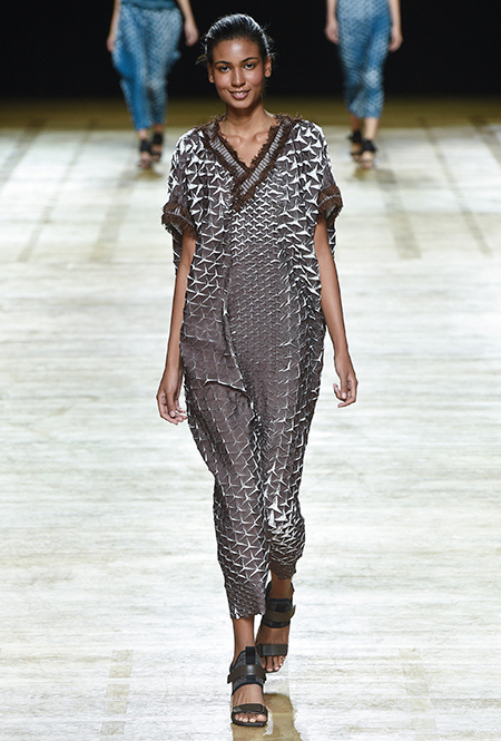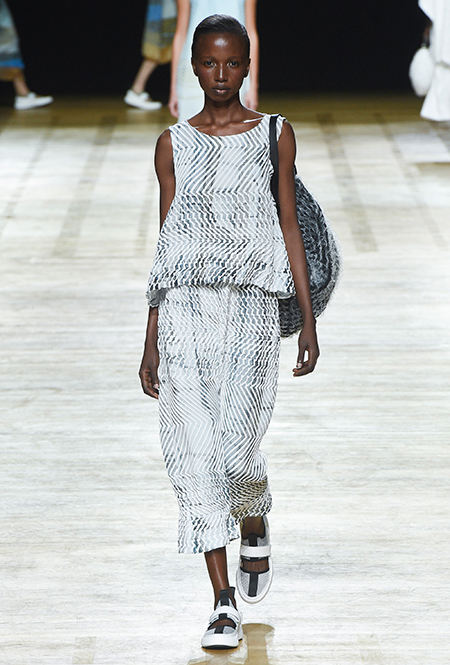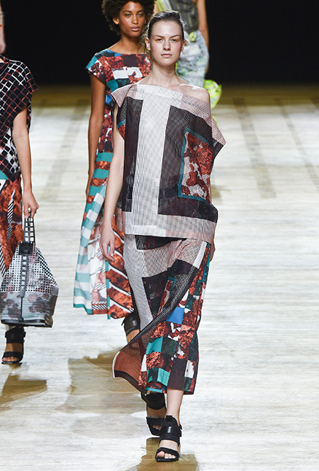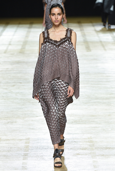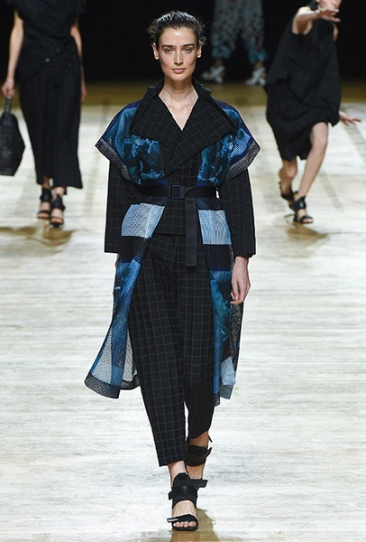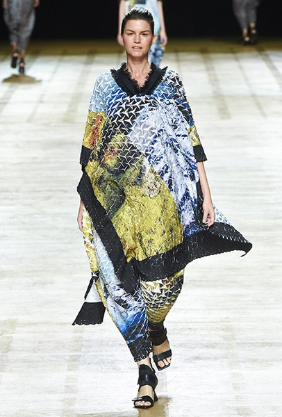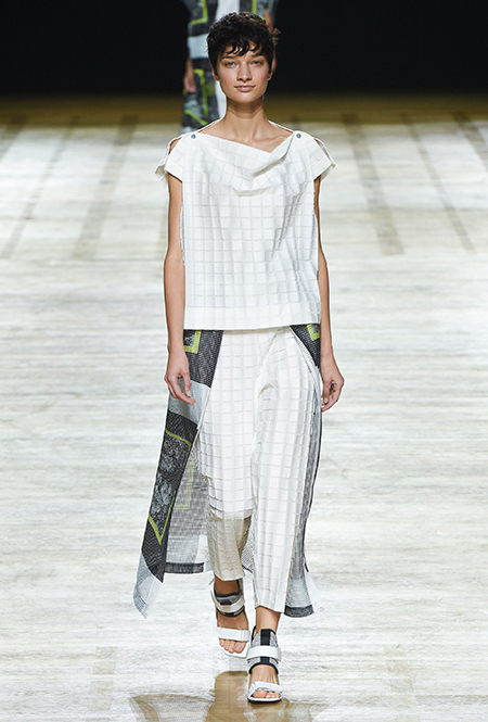 Как и было сказано выше, технология — краеугольный камень любой коллекции Issey Miyake. Объемная фактура, сложные плиссировки, напоминающие эффект гофре, ткани, словно выложенные мозаикой и пронизанные мелкой перфорацией — такая работа с материалом достойна отдельного упоминания.