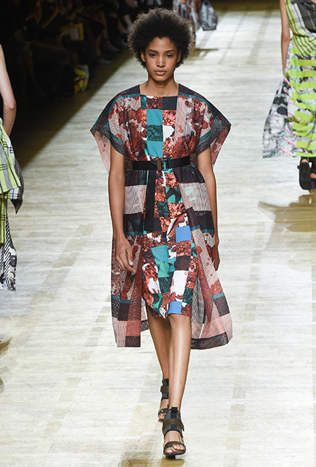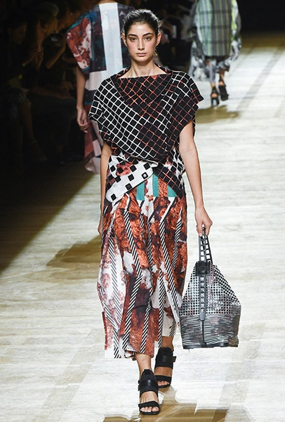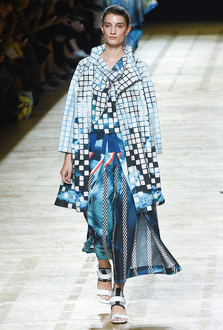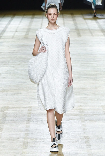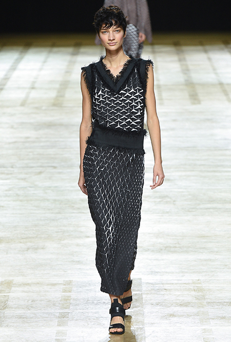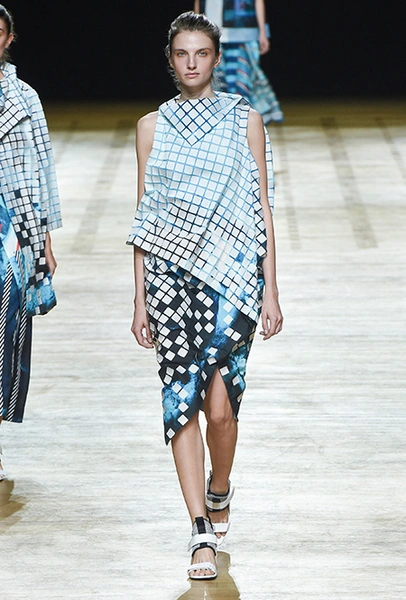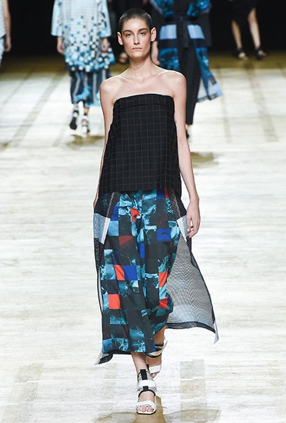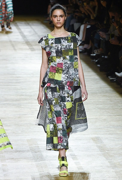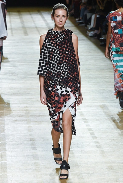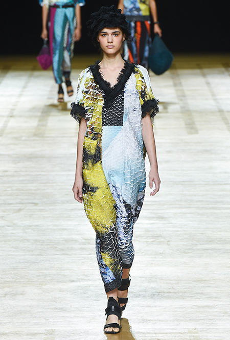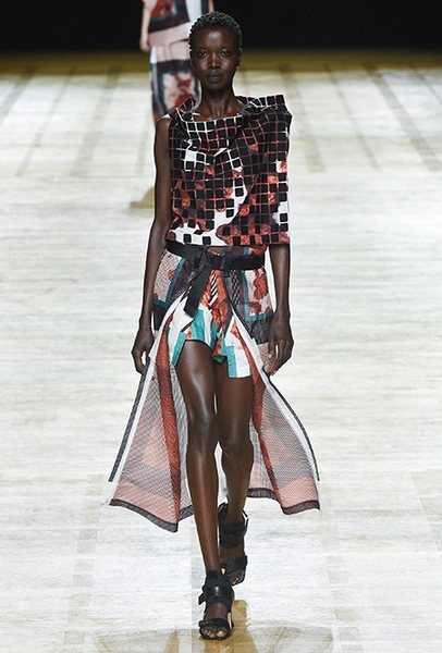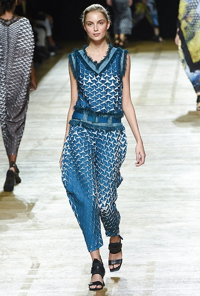 Как и было сказано выше, технология — краеугольный камень любой коллекции Issey Miyake. Объемная фактура, сложные плиссировки, напоминающие эффект гофре, ткани, словно выложенные мозаикой и пронизанные мелкой перфорацией — такая работа с материалом достойна отдельного упоминания.