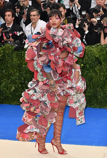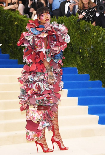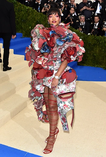 Самый запоминающийся образ Met Gala-2017 создала, разумеется, Рианна. Конформизм — это вообще не про стиль певицы из Барбадоса: чем сложнее задача, тем больше у РиРи азарта с ней справиться. Рианна была одной из тех немногих, кто осмелился выбрать наряд от Comme des Garçons: им стало платье, сшитое из множества круглых отрезов, по форме напоминаюших туфлю — это хорошо заметно, если взглянуть на него с разных ракурсов.