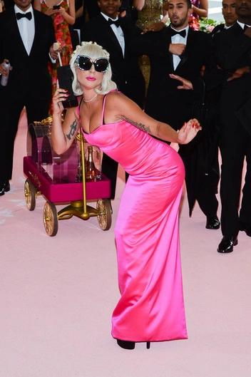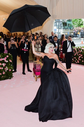 Кто, если не Леди Гага смог бы стать главной звездой вечера на мероприятии, тема которого «Кэмп: заметки о моде». Тогда певица не ограничилась одним нарядом, а переоделась прямо перед фотографами целых 4 раза. Все образы и их трансформации были придуманы американским дизайнером Брэндоном Максвеллом. Селебрити устроила настоящий перфоманс, поднимаясь по ступеням Метрополитен-музея. Гагу сопровождали пять танцоров, визажистка и личный фотограф.