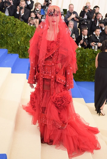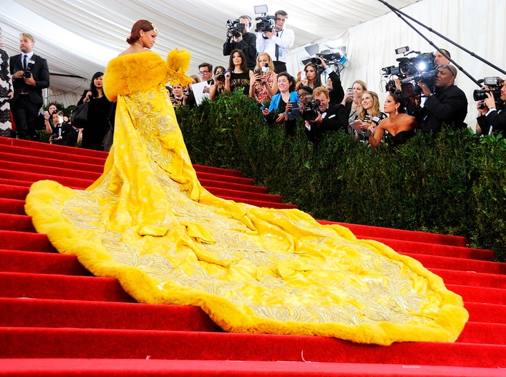От порицания со стороны модных критиков в тот год пострадала также Рианна — единственная гостья «Зазеркалья Китая» в платье от китайского дизайнера. Она поднялась к Метрополитен-музею как настоящая императрица: в короне, ожерелье и во всем желтом, который в Азии считается цветом царственности и величия. Этот образ готовился для певицы в течение двух лет: с момента, когда она увидела работы Гуо Пей в интернете, и до финальной примерки перед Балом. Этот наряд стал отличным поводом продемонстрировать гениальность китайских дизайнеров, которые не ограничиваются производством подделок Gucci и Louis Vuitton и способны создавать настоящие предметы искусства.