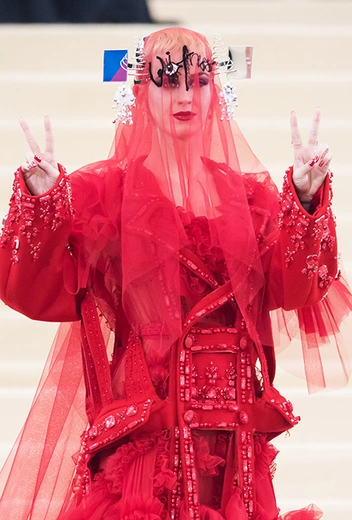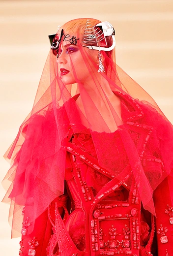 Тем не менее, красное платье, украшенное аппликациями и драпировками, все равно попало в список лучших нарядов вечера. Главным украшением и без того богато декорированного наряда стала маска на голове Кэти, на которой черными нитками было вышито слово Witness («Свидетель»). Эта вышивка — название пятого и пока последнего альбома певицы, который та презентовала через месяц после Бала.