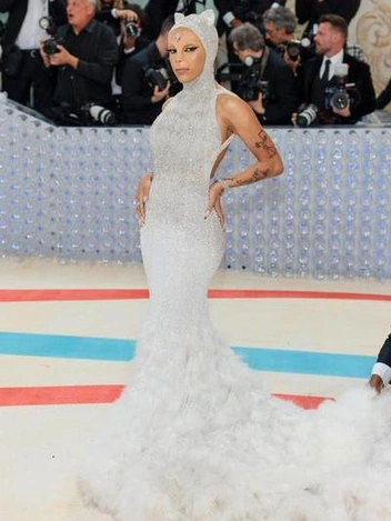В 2023 году Met Gala был посвящен Карлу Лагерфельду. Звезды почтили память великому кутюрье и вышли на ковровую дорожку в цвете шампань в его платьях. Отличилась Doja Cat: звезда появилась в роскошном платье Oscar de la Renta и попыталась повторить облик любимой кошки дизайнера — Шуппет. Наряд, плавно переходящий в капюшон с ушками, изготавливался модельерами практически полгода.