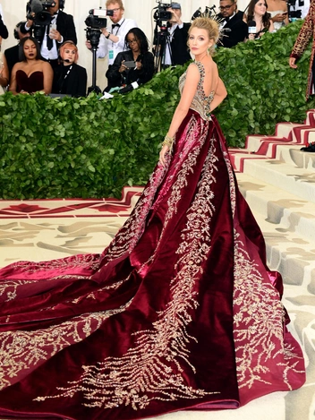 Темой бала в 2018 году была «Мода и католицизм». И Блейк Лайвли задание выполнила на отлично. Актриса не раз говорила, что не пользуется услугами стилиста: актриса сама отправилась к Versace, чтобы вместе разработать ее знаковый наряд. На создание роскошного образа потребовалось более 600 часов. Команда Atelier Versace во главе с Донателлой Версаче придумали двухцветное платье в бордово-золотистой гамме с длинным шлейфом.