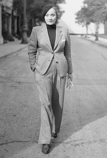 Сама Дитрих считалась новатором в моде и одной из главных женщин-революционеров, которые активно продвигали брюки и костюмы — как на экране, так и в повседневной жизни. Актриса неоднократно появляясь в них в кино: в 1930-м году вышла лента «Марокко» — сцена, где героиня Марлен облачена в мужской костюм, вошла в историю кинематографа и шокировала женщин. В идеально скроенных классических жакетах, брюках-клеш с завышенной талией, галстуках, морской униформе и мужских рубашках актриса снималась и в «Белокурой Венере» (1932 год), и в «Распутной императрице» (1934 год) — брючный костюм постепенно стал главной фишкой стиля Марлен Дитрих, образами которой вдохновляются до сих пор.