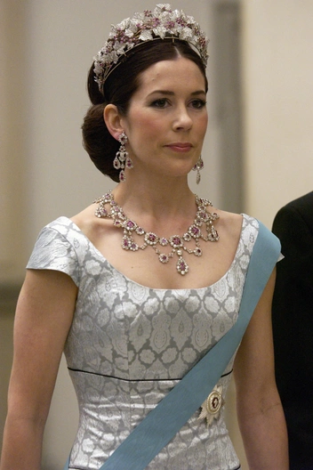 А самой первой тиарой в королевской карьере Мэри была бриллиантовая тиара, которую принцессе на свадьбу подарила Маргрете II. Источники утверждают, что королева выкупила изделие на аукционе специально для невестки. Сейчас Мэри надевает тиару на официальные приемы, а также носит в качестве ожерелья.