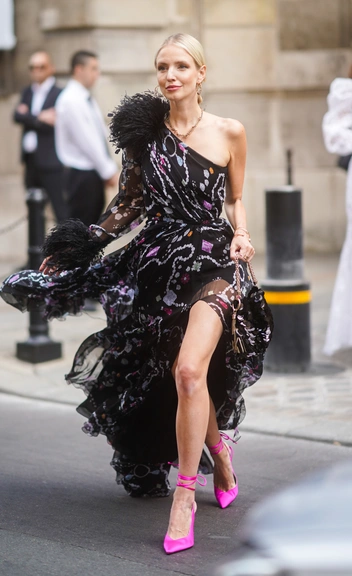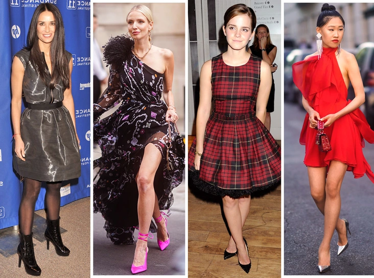 Если выбираете дерзкий и ультрамодный образ и хотите сделать акцент на обуви, не стоит добавлять к нему пару со множеством деталей. Если выбор пал на ботфорты, длина их должна быть выше колен. Не должно быть визуально обрезанных ног (читайте также: Стратегический набор: 19 пар обуви, которые никогда не выходят из моды). Обращаем внимание на вечерние туфли-лодочки, матовые или блестящие тонкие босоножки, а не сапоги. Важно, чтобы обувь доходила до середины голенища и не обрезала ноги.