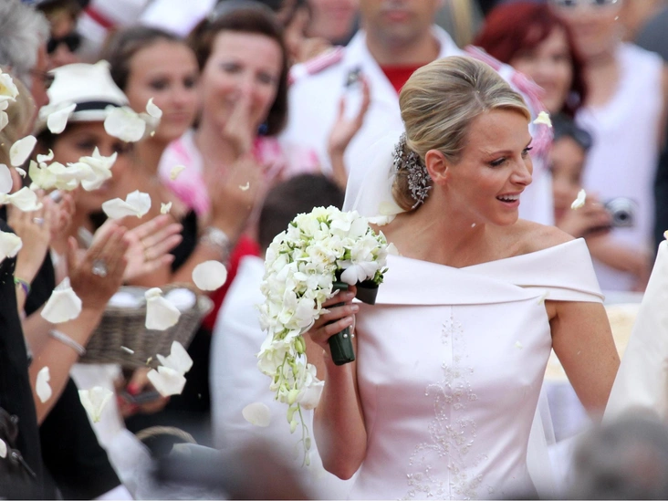 Шарлен Уиттсток, ныне княгиня Монако, на своей свадьбе с Альбером II в 2011 году появилась с красивым украшением в прическе вместо привычной тиары. Корсаж идеально сочетался с ее вуалью и платьем от Armani Prive.