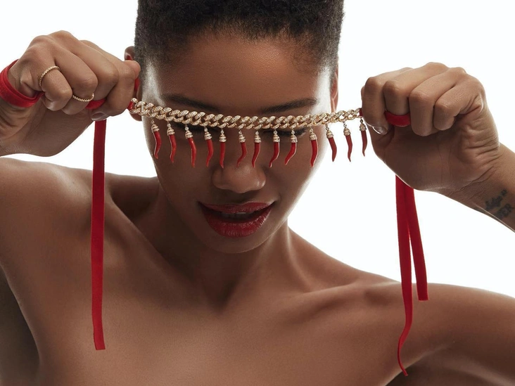 Градус повысит колье с кулоном-перчинкой из кораллов. Вариаций на эту жаркую тему несколько: серьги-хупсы, кулон из розового золота или колье с круглыми бриллиантами на крупно плетенной цепи. Приятное дополнение — изделие держится на завязках-бантике.