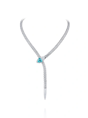Погружаясь в оттенки водной стихии, мы засматриваемся и на турмалин Параиба — драгоценный камень, который по праву считается одним из самых красивых в мире. Его чистый и глубокий оттенок напоминает лазурную гладь воды — это сочетание наглядно демонстрирует колье с бриллиантами светлых и темных оттенков.