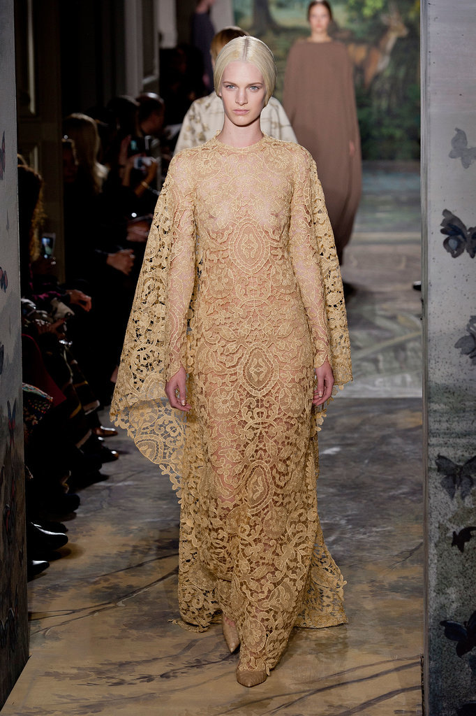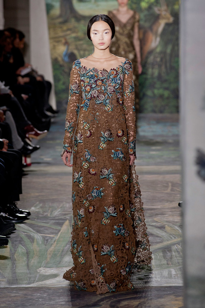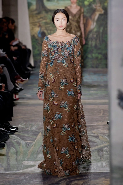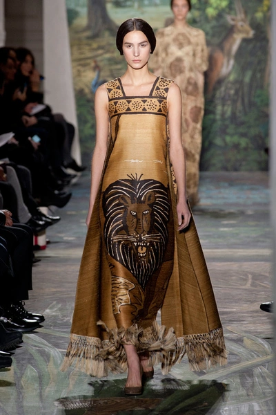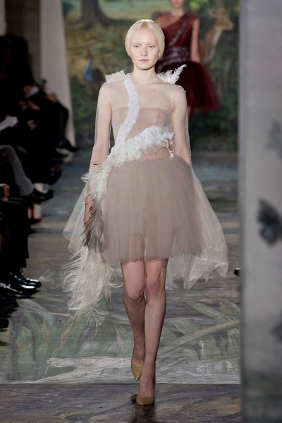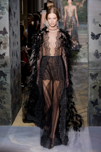 Показ начался с платья из тюля, юбка которого вручную расшита нотами: по ним можно сыграть "Травиату" Джузеппе Верди. Затем на подиуме появился наряд, вдохновленный картиной немецкого живописца Лукаса Кранаха (Lucas Cranach) "Адам и Ева". Его сменило платье, состоящее из пяти тысяч золотых и серебряных нитей. Одной из жемчужин коллекции стали лебединые платья, расшитые перьями. Их представили в бордовом, оливковом и пудровом цвете.