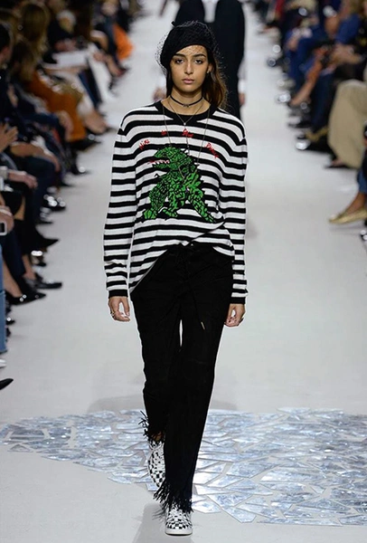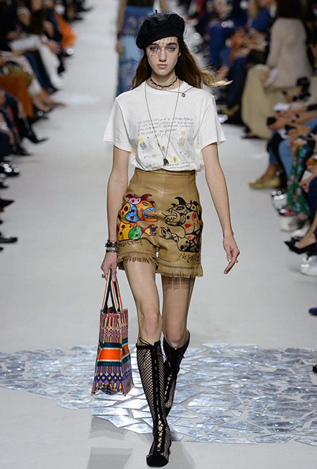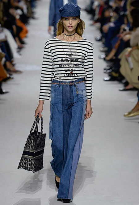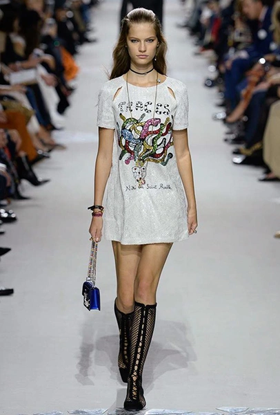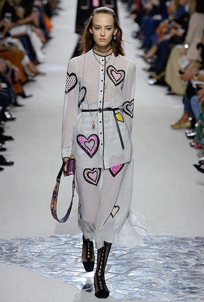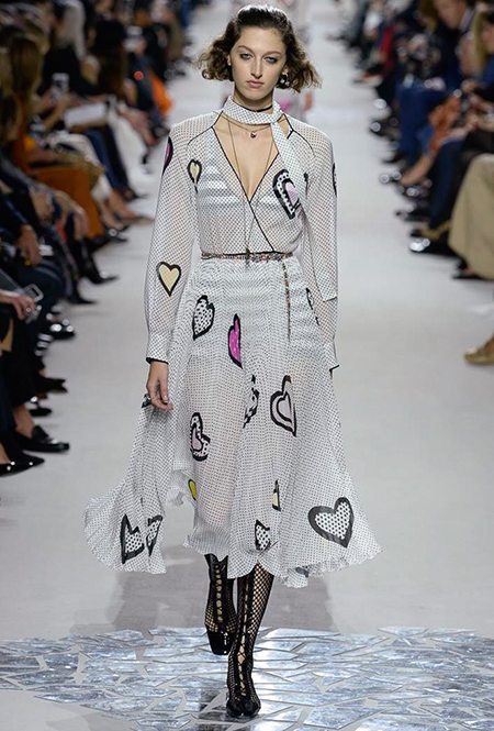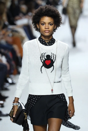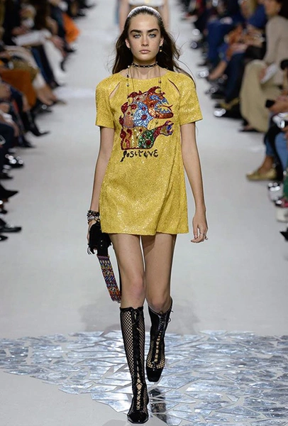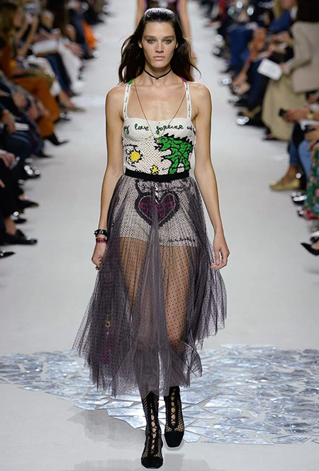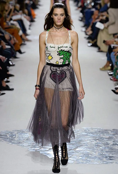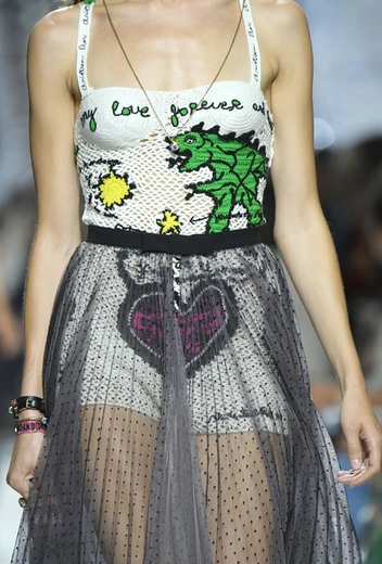 Такую любовь к насыщенному цвету и более «сочным» визуальным образам объясняют заявленные референсы коллекции. Кьюри вновь обыгрывает «женскую» тему, на этот раз делая оммаж художницам. Не случайно показ открыла Саша Пивоварова в тельняшке с надписью Why Have There Been No Great Women Artists? (фраза отсылает к названию эссе американского историка искусств Линды Нохлин). Муза Dior в этом сезоне – скульптор и арт-деятель 70-х годов Ники де Сен-Фалль. Ее скульптуры и рисунки – торжество цвета. Некоторые из излюбленных тем Ники – изображения цветных сердец, фантастических животных и символов Таро (их она любила так же как Кристиан Диор)– Кьюри превратила в принты и аппликации.