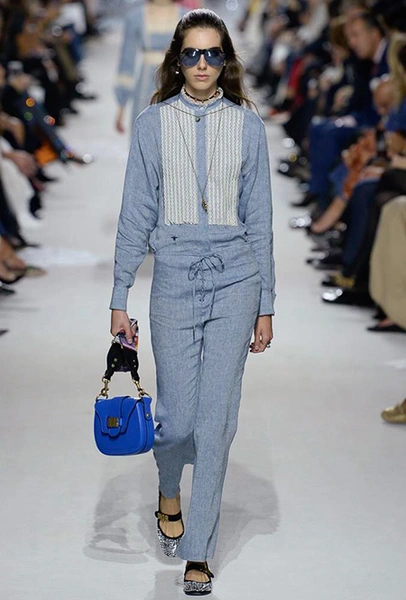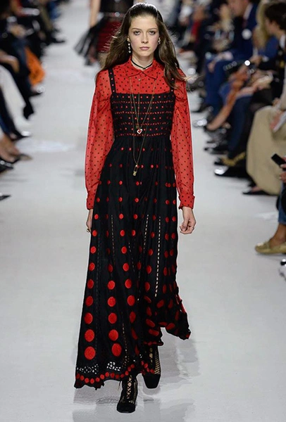В этот раз Кьюри вообще часто вспоминала Боана, который из всех «рулевых» модного дома цитируется, как ни странно, реже всего. К его работам отсылают и те самые комбинезоны, и клетка и принт-горошек – им усыпаны полупрозрачные блузы и платья с рюшами из тонкой ткани.