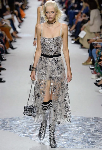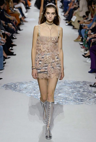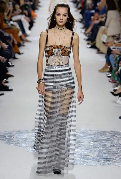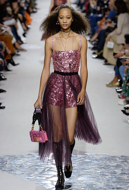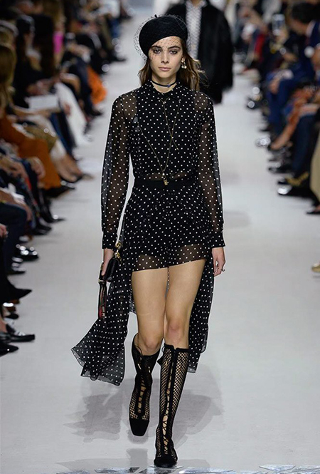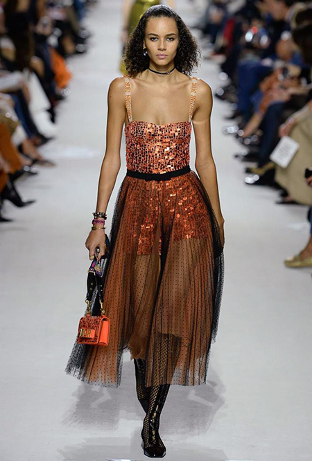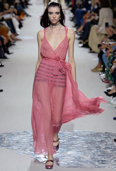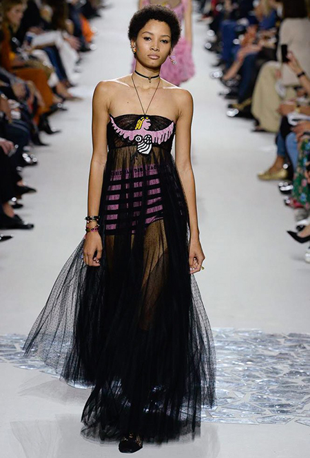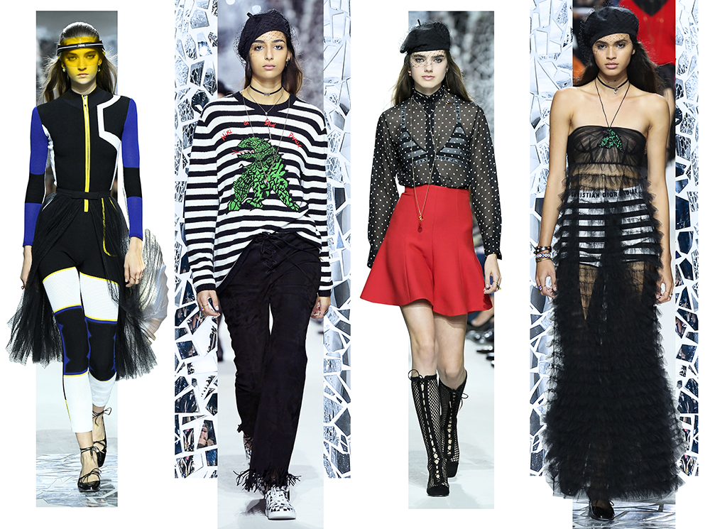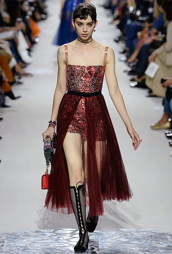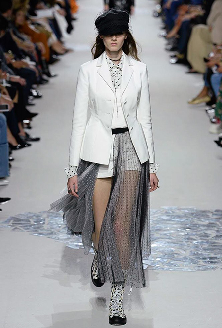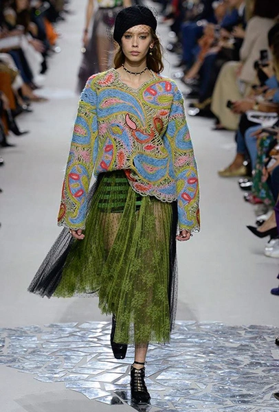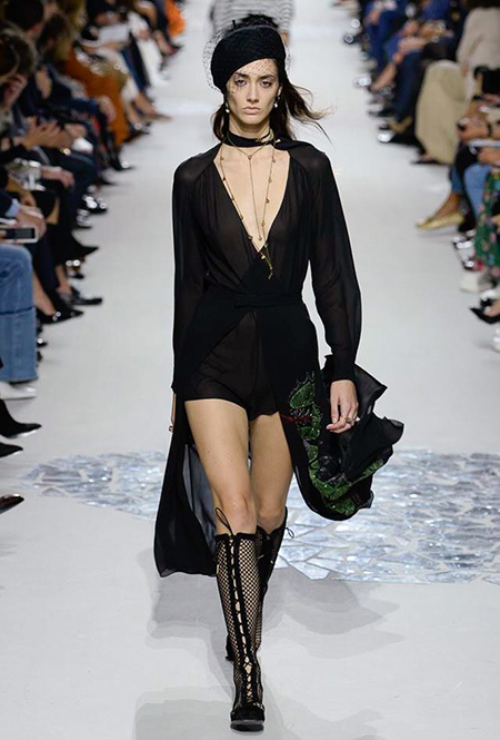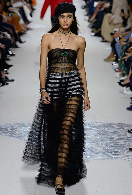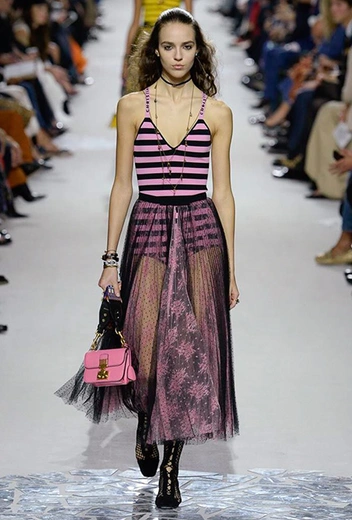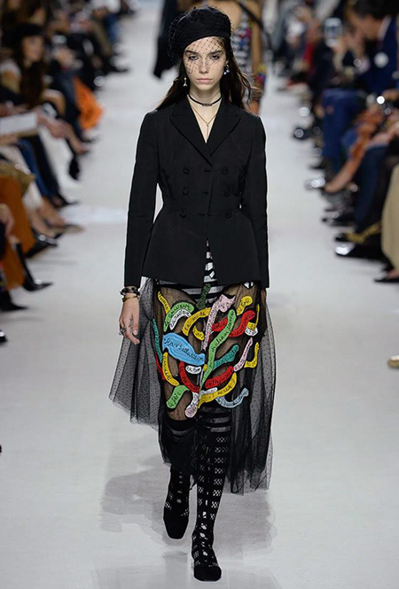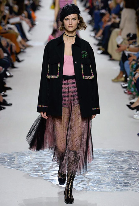 Вот и на этот раз на подиуме были платья с плотно прилегающими к телу, четко скроенными, напоминавшими корсеты, лифами; и длинные полупрозрачные юбки в пол – их Мария Грация как всегда комбинирует с «массивным» верхом – oversize-жакетами, кожаными куртками и свитерами. Как и в коллекции FW 2017, в этом сезоне есть элегантные, отсылающие к классике Dior, береты. Теперь они стали еще более «ретро» - Кьюри снабдила их невесомыми, спадающими на лоб вуалями. Полупрозрачная ткань юбок вновь украшена яркими аппликациями так же как и лифы некоторых платьев. Одним словом, Dior остается очень женственным, очень практичным и очень коммерческим одновременно.