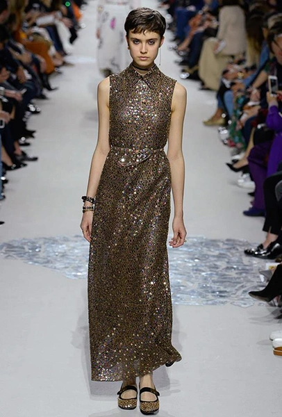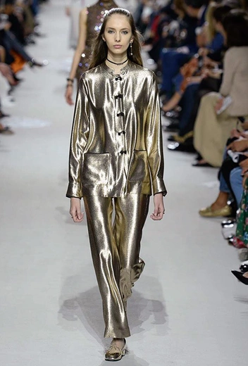 Сама Ники обожала моду и считала ее важным способом самовыражения. Одним из ее близких друзей был Марк Боан – креативный директор Dior с 1960 по 1989 год. Их совместное фото на примерке одного из нарядов стало ключевым в мудборде Марии Грации. На нем Ники в длинном блестящем платье. Его в новой коллекции напоминает сверкающий золотистый брючный костюм-пижама.