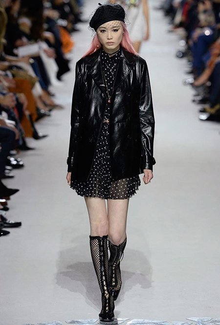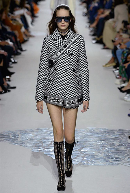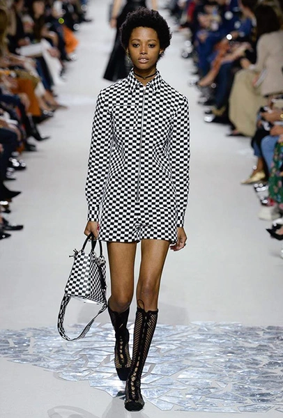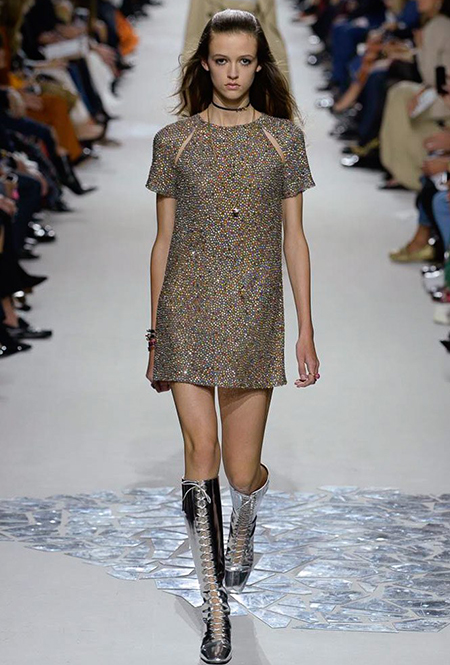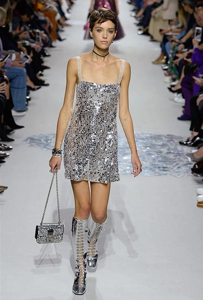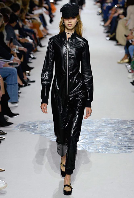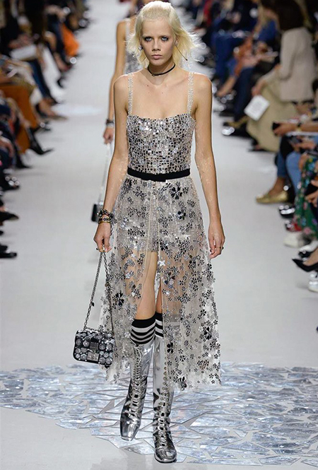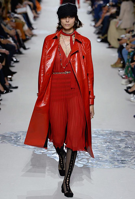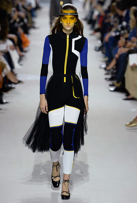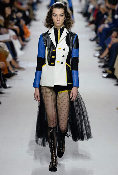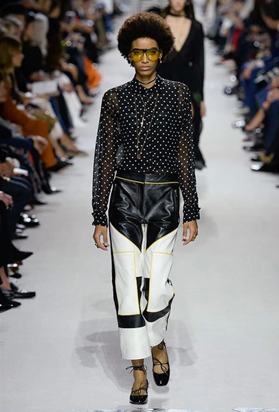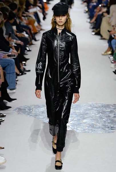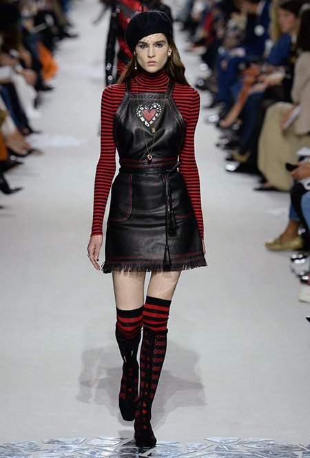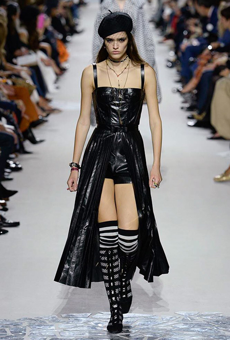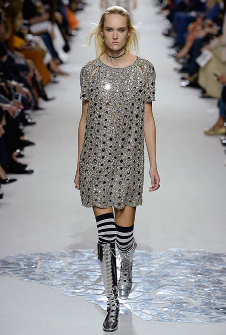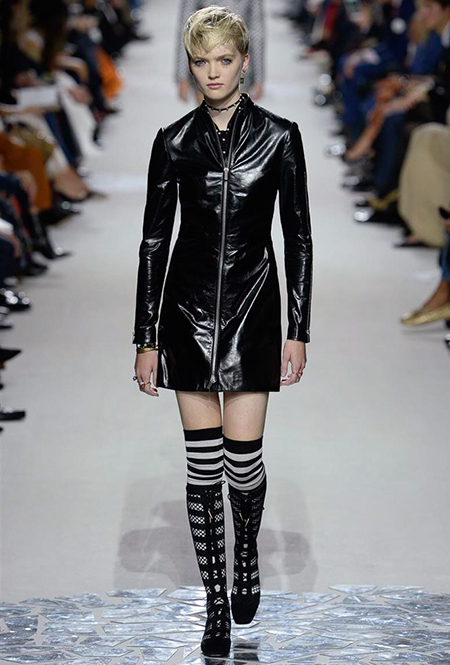 В чем же тогда новизна? Эта коллекция у Марии Грации получилась несколько ярче и драматичнее предыдущих. Здесь есть графичный color blocking, как на картинах художников-авангардистов. Из белых и синих, с вкраплениями желтого, блоков «составлены» удлиненные кожаные жакеты и облегающие комбинезоны. Один из основных принтов – психоделические, в стиле «оп-арта», черно-белые узоры – мелкая клетка на жакетах, брюках и пальто, и горизонтальные полосы на гетрах (они на этот раз, пожалуй, главный и самый эффектный аксессуар). Дизайнер больше не избегает ярких цветов, вроде красного, холодного розового и насыщенного зеленого. Появился даже целый блок сверкающих нарядов, будто сотканных из пайеток – серебристых, синих, красных, оранжевых, желтых. А один из луков – розовое короткое платье с пышным подолом, украшенным рюшами, и вовсе отсылает к стилю эксцентричных токийских Harajuku.