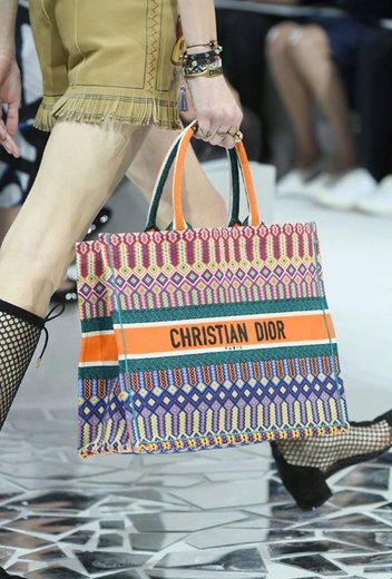 Миниатюрные прямоугольные сумки из кожи рептилий похожи на детали из пестрого детского конструктора. Некоторые из них снабжены широким ремешком с полюбившейся миллениалам надписью J’Adior, а значит, заведомо обречены на коммерческий успех. Не менее популярной, скорее всего будет и большая сумка-tote из плотной ткани с плетением, украшенная пестрым этническим принтом и крупной надписью Christian Dior по центру. Логомания возвращается, и Кьюри не могла не подхватить этот тренд.
