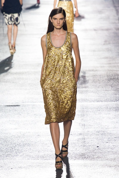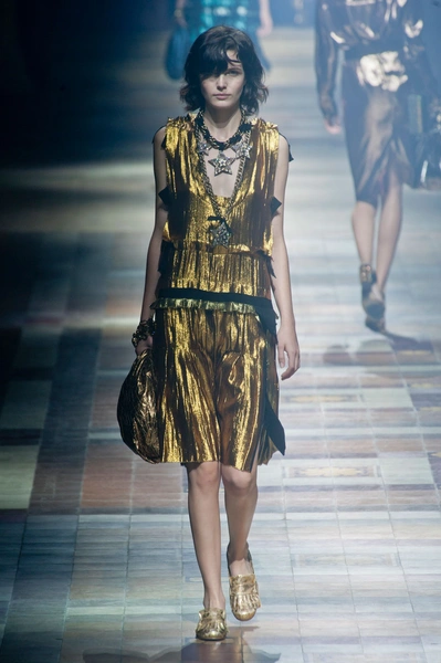 Пока в магазины только-только поступают новинки из коллекций осень-зима 2013/14, мы уже говорим о них как о прошлом сезоне. Нам уже скучно видеть минимализм Celine и спортшик Hermes. Мы уже ждем, как дети, лета. Потому что в сезоне весна-лето 2014 нам обещают настоящий карнавальный коктейль из блесток, шифона, рюш, кружева, современного искусства и графики. Но это все было на Неделях моды в Милане, Нью-Йорке и Лондоне. А в Париже самый сильный тренд – золото. Сразу пять ключевых игроков рынка люкса показали коллекции именно в металлической цветовой гамме. Остряк Альбер Эльбаз (Alber Elbaz), креативный директор Lanvin, был признан единогласно флагманом «золотого» движения. Эди Слиман (Hedi Slimane) из Saint Laurent как будто завернул моделей в золотую фольгу, как конфетки. Но только с горькой начинкой. Умница Дрис Ван Нотен (Dries Van Noten) использовал барочные узоры и не забыл повязать некоторым моделям золотые банты и добавить золотые оборки к платьям. Последние выходы на шоу Givenchy прямо-таки стали «золотой точкой» показа. Когда модели шли по подиуму, в золотых пластинах платьев отражался свет софитов и миллионом солнечных зайчиков бежал по залу. Haider Ackermann тоже не смог проигнорировать «золотой» тренд, но его золото получилось чуть пыльным, как будто бы оно очень долго стояло в семейной сокровищнице. Впрочем, Аккерманн всегда за приглушенные тона.
