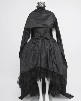 Речь идет о модели «Labia», которую Сен-Лоран создал примерно в 1959–1960 годах. Это было черное платье из таффеты — синтетического материала, похожего на шелк — и кружева. Оно состояло из корсета без бретелей и пышной юбки, из-под которой выглядывал кружевной подъюбник. Отдельно к нему также шел длинный кейп с необычным воротником-стойкой (читайте также: Силуэт New Look, серый цвет и еще 8 вещей, которые ввел в моду Кристиан Диор).