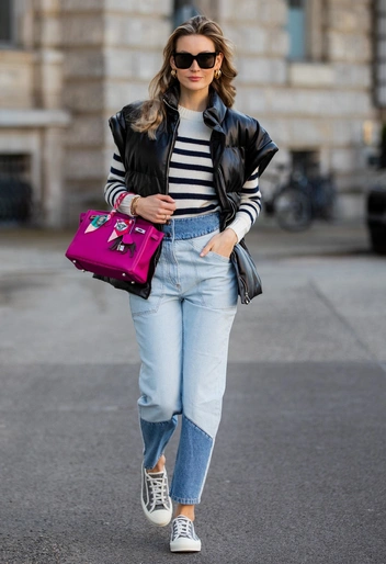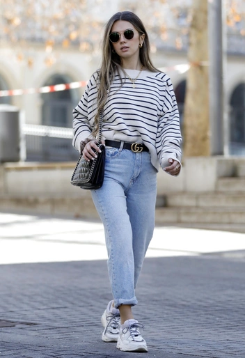 Выбирая яркие оттенки, нужно грамотно сочетать тельняшку с другими элементами гардероба. Например, отлично смотреться будут поясные изделия белого цвета. Универсальным вариантом станут классические голубые джинсы.